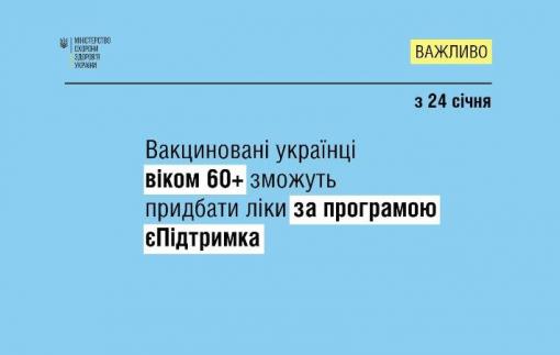 Уряд розширює програму єПідтримка і з 24 січня українці, віком від 60 років, зможуть витратити кошти, нараховані за програмою, на придбання ліків. Відповідну постанову Кабінет Міністрів України ухвалив на засіданні 19 січня.