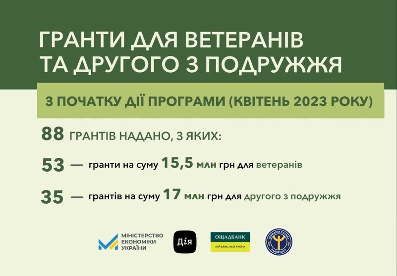 “Ветерани та члени їхніх родин все активніше долучаються до грантової програми, яку пропонує держава для підтримки підприємництва. На сьогодні вже 88 переможців отримають гранти від 250 тис. грн до 1 млн грн на власну справу. 60% з них - ветерани, які готові займатись підприємництвом або масштабувати вже діючий бізнес та залучати до своєї справи побратимів. Наші захисники та захисниці мають знати, що держава готова фінансово підтримати їх після повернення з фронту, якщо вони матимуть бажання стати підприємцями, і вони можуть готувати свої бізнес-ідеї. Або ж вже зараз долучити до їх реалізації своїх дружин чи чоловіків”, - повідомила заступник Міністра економіки України Тетяна Бережна.