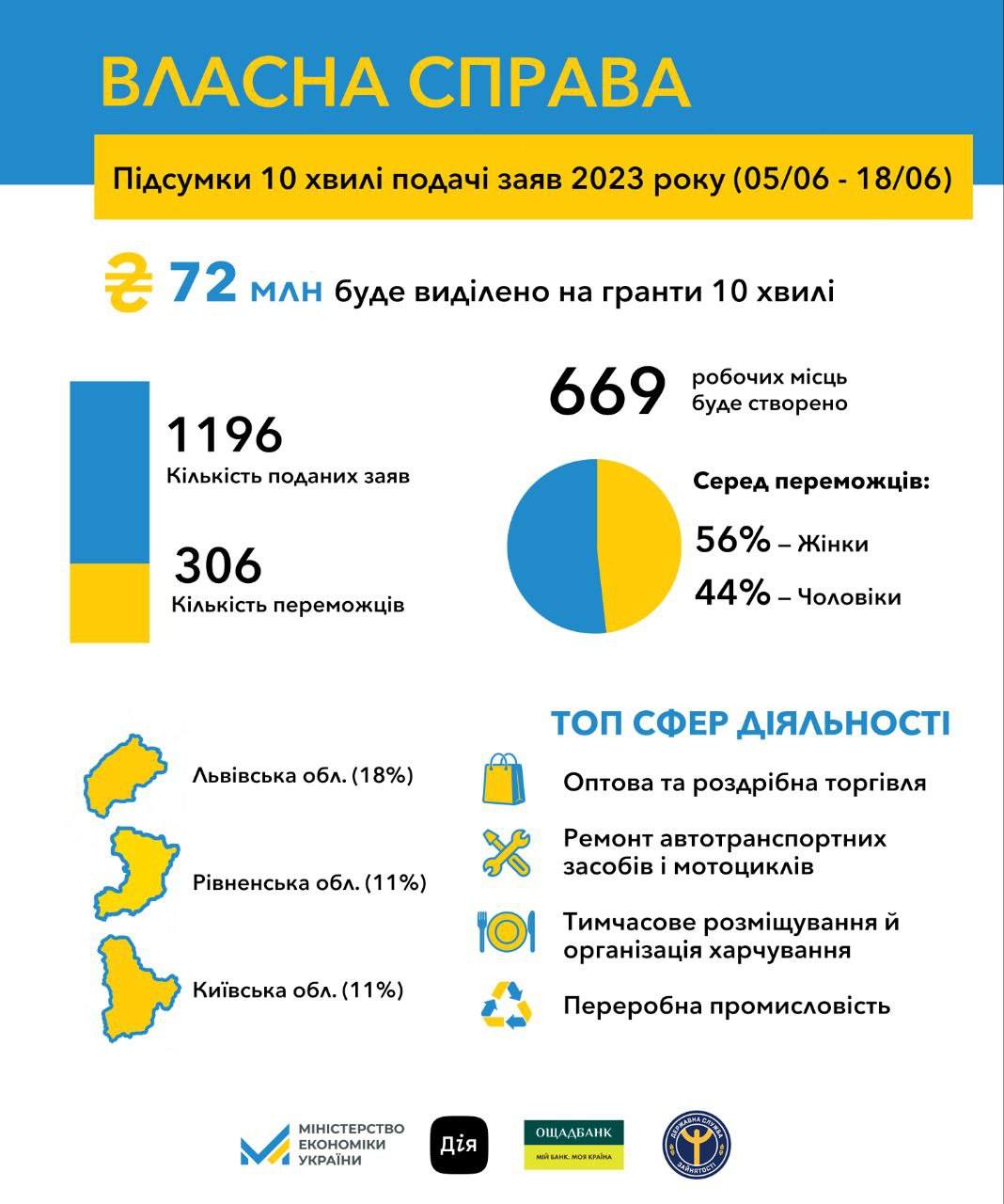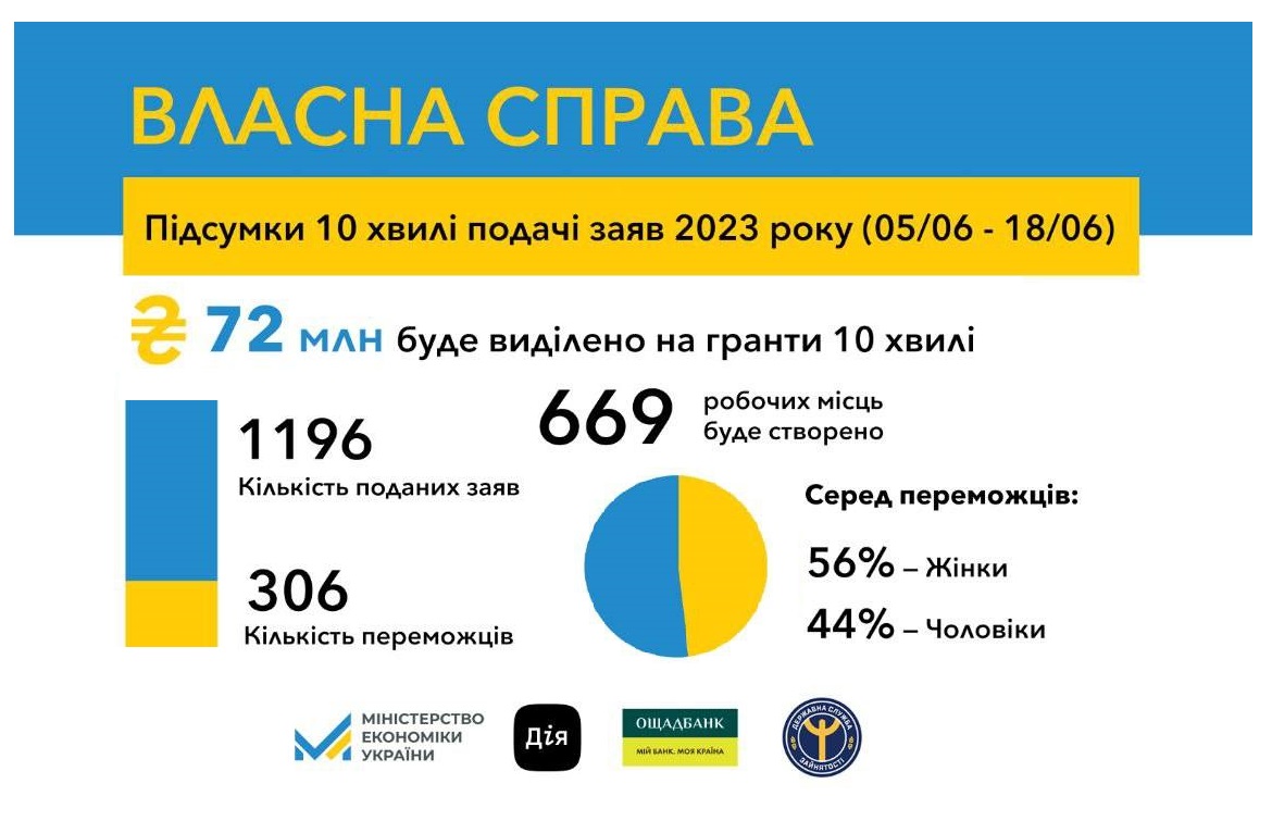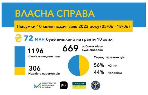 “За результатами десятої хвилі подачі заяв на мікрогранти 306 українців отримають 72 млн грн на старт або розширення власної справи. Загалом з початку цього року можливістю отримати фінансову підтримку від держави на розвиток бізнесу за програмою “Власна справа” скористались вже 2800 українців. Держава інвестує в їх бізнес-проекти 665 млн грн. Це інвестиції не лише в розвиток підприємництва, це також інвестиції в активізацію ринку праці, адже цьогорічні грантоотримувачі створять понад 6 тисяч нових робочих місць”, - повідомила Тетяна Бережна.