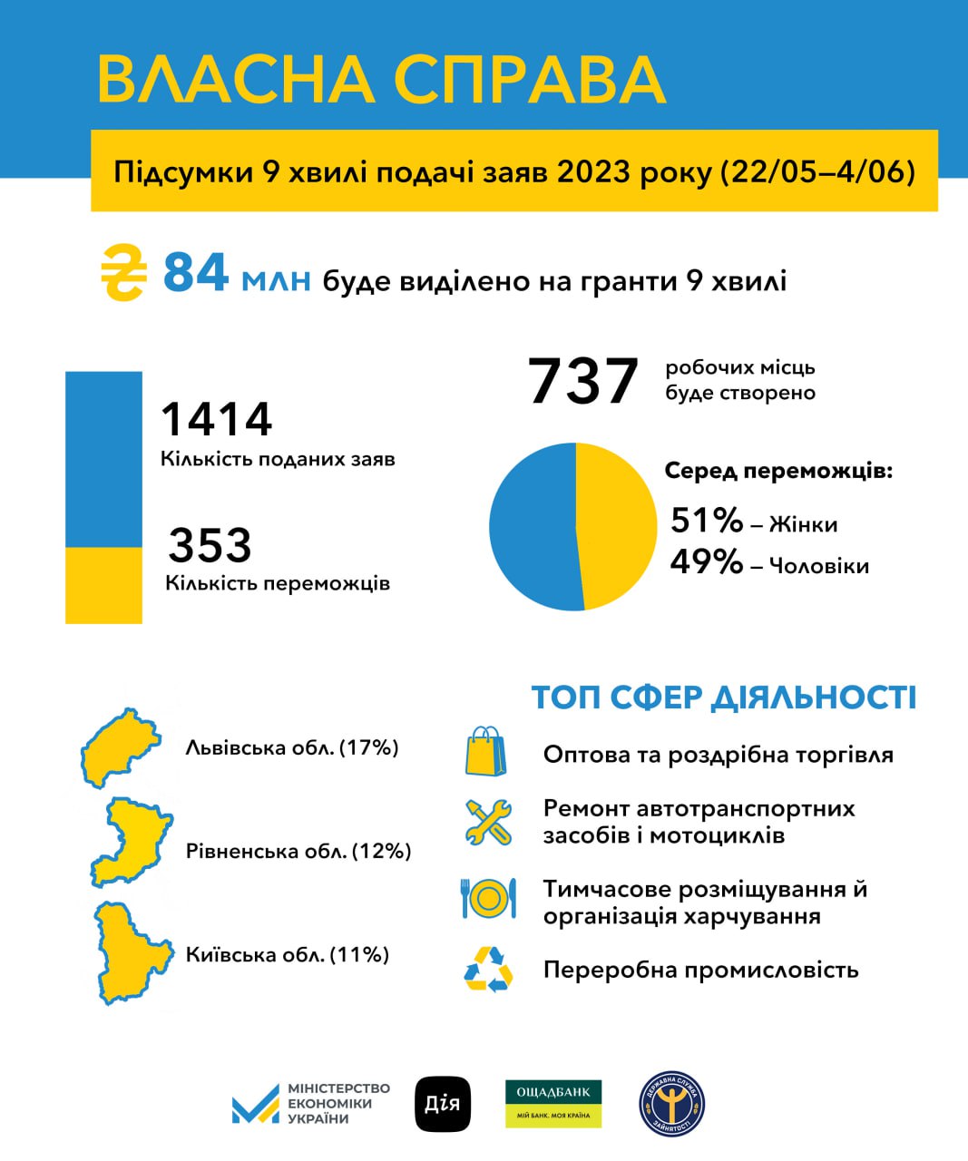 Серед отримувачів мікрогрантів дев’ятої хвилі 51% жінок і 49% чоловіків. Найбільше з них із Львівської (61 особа), Рівненської (44 особи), Івано-Франківської (27 осіб), Житомирської (23 особи), а також міста Києва (26 осіб).