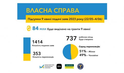 “За результатами дев’ятої цього року хвилі подачі заяв на мікрогранти 353 українці визнано переможцями. Вони отримають від держави фінансову підтримку на започаткування або розширення свого бізнесу більше ніж на 84 млн грн. Загалом з початку дії програми “Власна справа” можливістю отримати мікрогрант скористались майже 6 тисяч українців. 5 тисяч з них вже отримали кошти на загальну суму 1,2 млрд грн та реалізують свої бізнес-проекти, працюють, сплачують податки, створюють нові робочі місця. За рік дії програми отримувачі мікрогрантів створять понад 14 тисяч робочих місць”, - повідомила Тетяна Бережна.