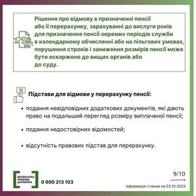 Рішення про відмову в призначенні пенсії або її перерахунку, зарахуванні до вислуги років для призначення пенсії окремих періодів служби в календарному обчисленні або на пільгових умовах, порушення строків і заниження розмірів пенсії може бути оскаржено до вищих органів або до суду.