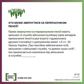Військовослужбовці, які звільнені з військової служби, мають право звернутись за перерахунком пенсії на підставі підвищення грошового забезпечення відповідних категорій військовослужбовців або на підставі нових документів, доданих до пенсійної справи.