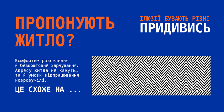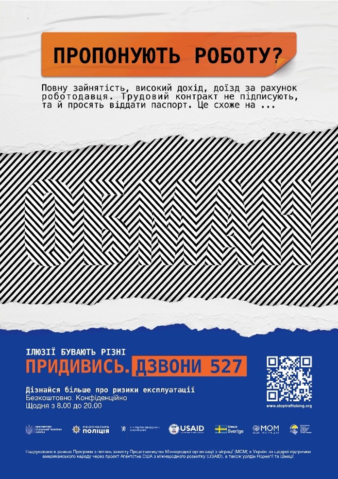 Наблизившись до зони можна побачити оптичну ілюзію, у дизайн якої “вшито” історії, реальних ситуацій вербування та втягнення у ситуацію торгівлі людьми та розміщена інформація з номером Національної гарячої лінії з протидії торгівлі людьми та консультування мігрантів 527, гарячої лінії з протидії торгівлі людьми, запобігання та протидії домашньому насильству, насильству за ознакою статі та насильству стосовно дітей 15-47 та QR-кодом на відео-ролики кампанії та вебсайт www.stoptrafficking.org .
