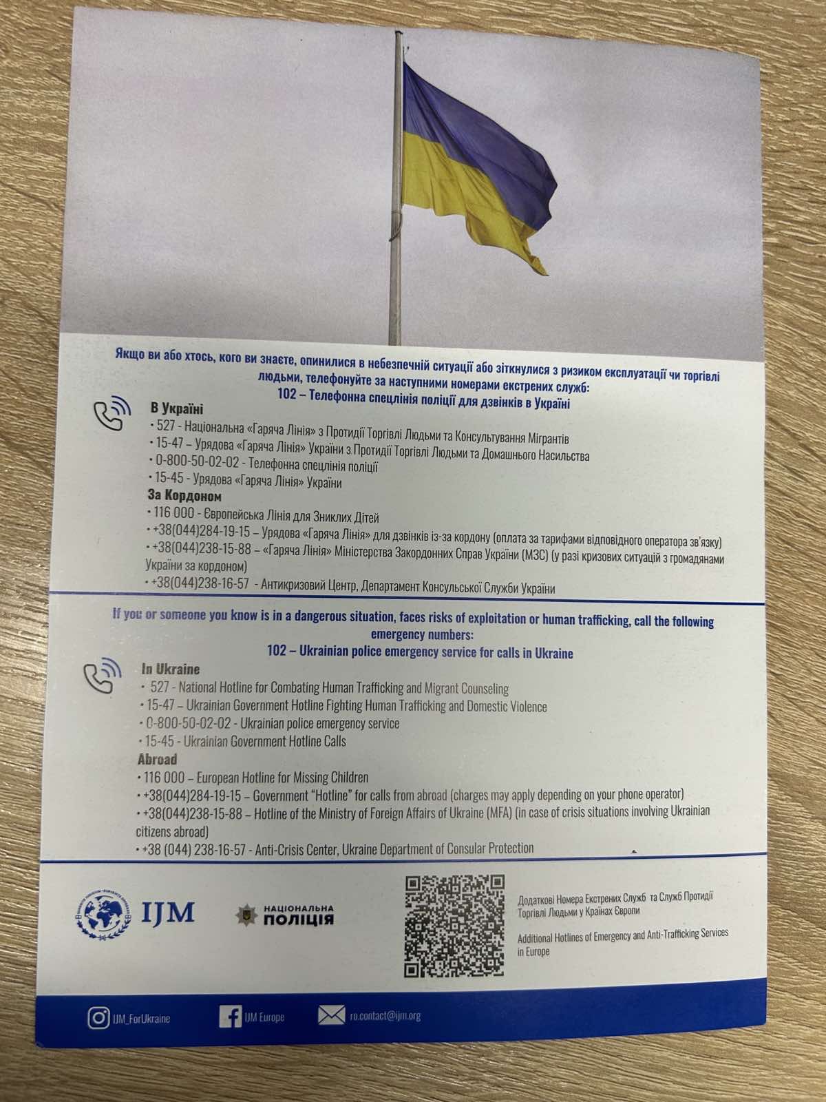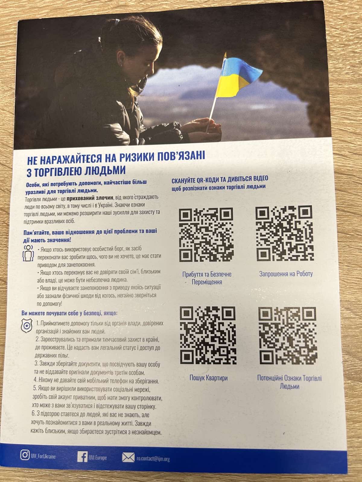 Присутні отримали Пам’ятки для осіб, постраждалих від торгівлі людьми, розроблені Національною соціальною сервісною службою України та буклет «Не наражайся на ризики, пов’язані з торгівлею людьми», що містять перелік номерів телефонів «гарячих ліній» в Україні та за кордоном.