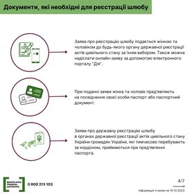 ▫ Заява про реєстрацію шлюбу подається жінкою та чоловіком до будь-якого органу державної реєстрації актів цивільного стану за їхнім вибором. Також можна надіслати онлайн-заяву за допомогою електронного порталу “Дія”.
