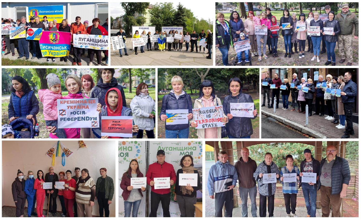 Луганщина проти фейкового окупантського "референдуму" - переселенці з Луганської області виходять на вулиці та площі українських міст, які стали прихистком для їхніх сімей, і висловлюють невдоволення псевдореферендумом.