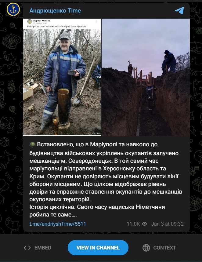 «Окупанти не довіряють місцевим будувати лінії оборони місцевим. Що цілком відображає рівень довіри та справжнє ставлення окупантів до мешканців окупованих територій.