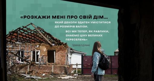 Юлія Машута: Зараз кожен день починається зі зведень обстрілів міст і сел України. Росіяни випалюють все на своєму шляху, в основному ж стріляють по житлових будинках. Ми вже втратили рахунок руйнувань і для багатьох це стало просто цифрою статистики цієї війни. Але загарбник руйнує не лише стіни, а й життя людей. «Свій дім» — не просто про стіни, це про людей, яких позбавили дому.