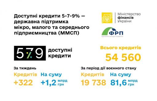 З моменту старту Державної програми «Доступні кредити 5-7-9%» суб’єкти підприємництва отримали від уповноважених банків 54 560 кредитів на загальну суму 171,23 млрд грн, з яких 35 184 – від банків державного сектору економіки на загальну суму 69,08 млрд гривень (станом на 13.02.2023 р.).