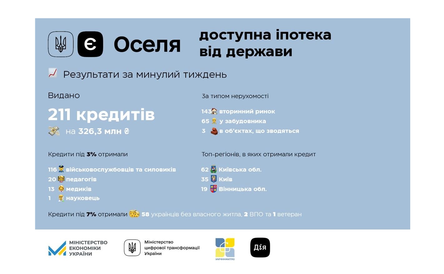 Зокрема, минулого тижня українці отримали за програмою єОселя 211 кредитів на 326 млн грн, серед яких: