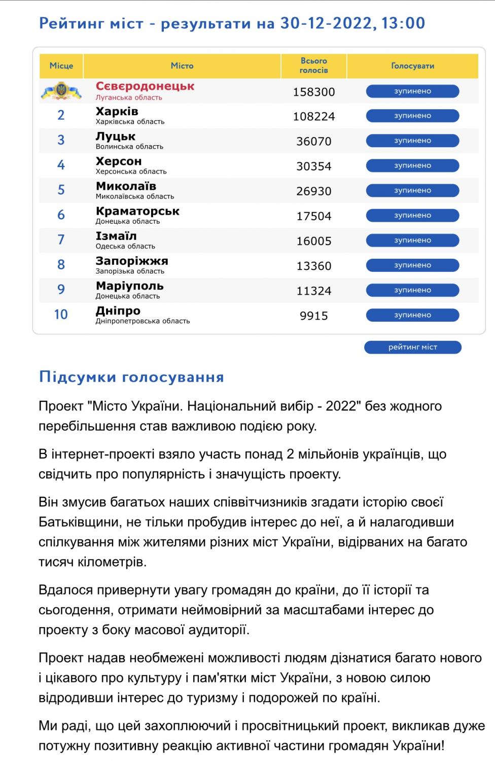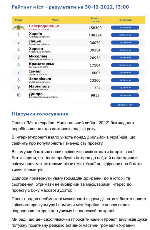 Серед усіх міст країни - тимчасово обласний центр обрали містом року. Загалом у голосуванні взяли участь понад два мільйони українців.
