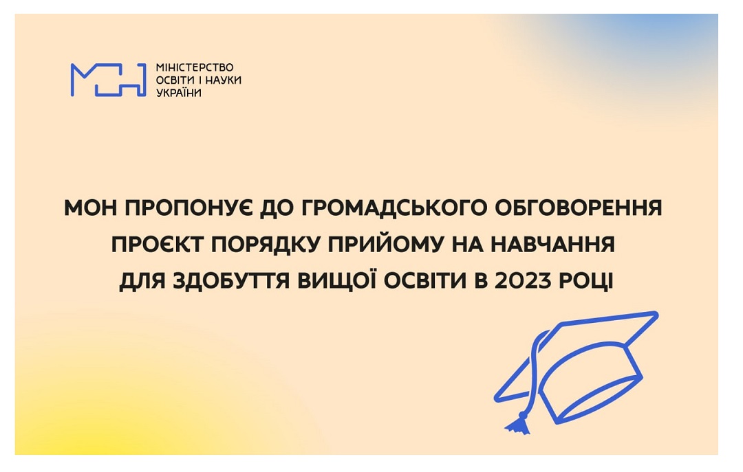 Міністерство освіти і науки України підготувало до громадського обговорення проєкт Порядку прийому на навчання для здобуття вищої освіти в 2023 році .