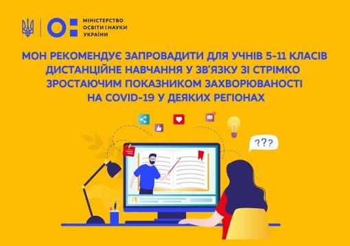 МОН РЕКОМЕНДУЄ ЗАПРОВАДИТИ ДЛЯ УЧНІВ 5-11 КЛАСІВ ДИСТАНЦІЙНЕ НАВЧАННЯ У ЗВ’ЯЗКУ ЗІ СТРІМКО ЗРОСТАЮЧИМ ПОКАЗНИКОМ ЗАХВОРЮВАНОСТІ НА COVID-19 У ДЕЯКИХ РЕГІОНАХ