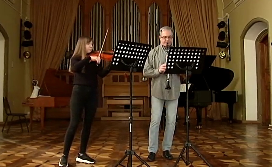 На сцені Рівненської обласної філармонії Дмитро Переясловець та Олена Ковальова. Це подружжя із Сєверодонецька. Дмитро грає на кларнеті: "Я вважаю цей інструмент - один саме з таких багатших серед духових дерев'яних".