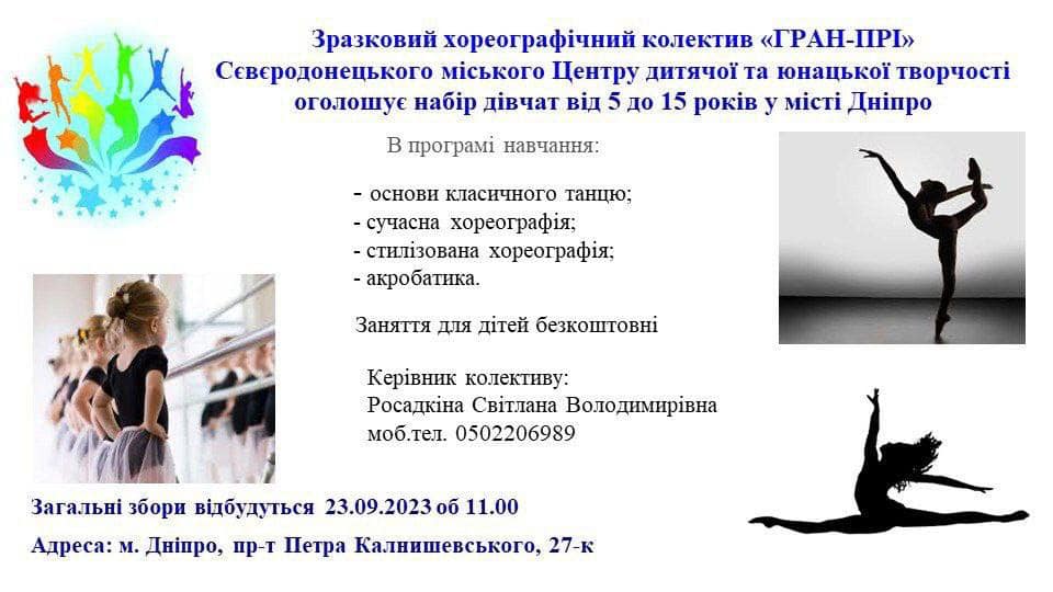 - Зразковий хореографічний колектив «ГРАН-ПРІ» (діти віком від 5 до 14 років);