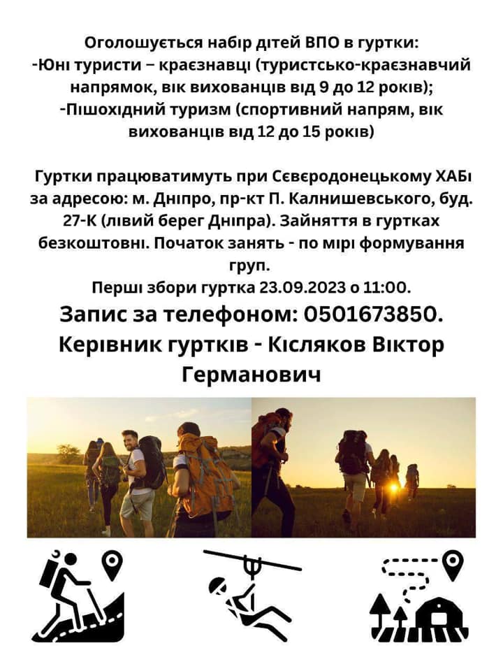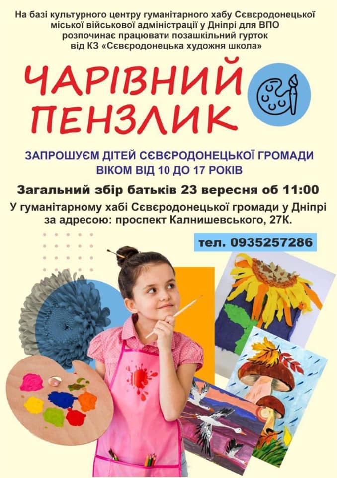 На базі культурного центру Гуманітарного хабу Сєвєродонецької міської військової адміністрації у м. Дніпро (проспект Калнишевського, 27-К) для ВПО розпочинають працювати гуртки Сєвєродонецького міського Центру дитячої та юнацької творчості, Сєвєродонецького міського Центру національно-патріотичного виховання туризму та краєзнавства учнівської молоді, КЗ "Сєвєродонецької художньої школи", Сєвєродонецького міського Палацу культури.