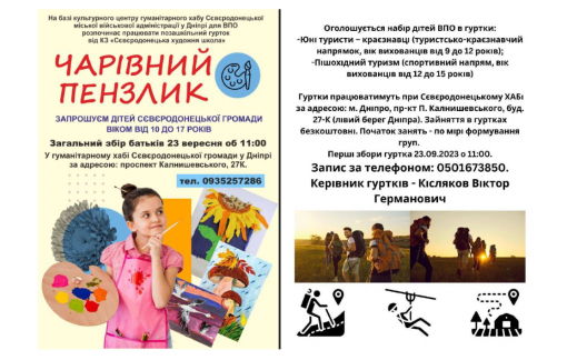 На базі культурного центру Гуманітарного хабу Сєвєродонецької міської військової адміністрації у м. Дніпро (проспект Калнишевського, 27-К) для ВПО розпочинають працювати гуртки Сєвєродонецького міського Центру дитячої та юнацької творчості, Сєвєродонецького міського Центру національно-патріотичного виховання туризму та краєзнавства учнівської молоді, КЗ "Сєвєродонецької художньої школи".