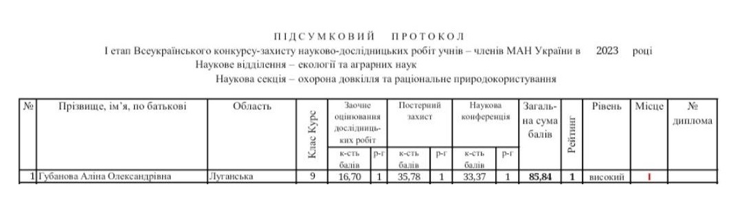 Після розгляду та захисту всіх представлених робіт жюрі обласного етапу Всеукраїнського конкурсу-захисту науково-дослідницьких робіт визнало наукову роботу Аліни Губанової найкращою та присудило їй І-ше місце.