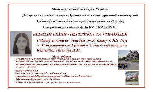 Від Сєвєродонецької міської територіальної громади на обласному етапі заходу була представлена наукова робота учениці 9-А класу Середньої загальноосвітньої школи І-ІІІ ступенів № 4 Аліни Губанової «Відходи війни - переробка та утилізація».