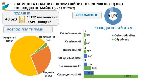 Мешканцями Луганської області станом на 11.09.2023 подано 40 623 інформаційних повідомлення про пошкоджене/знищене нерухоме майно.