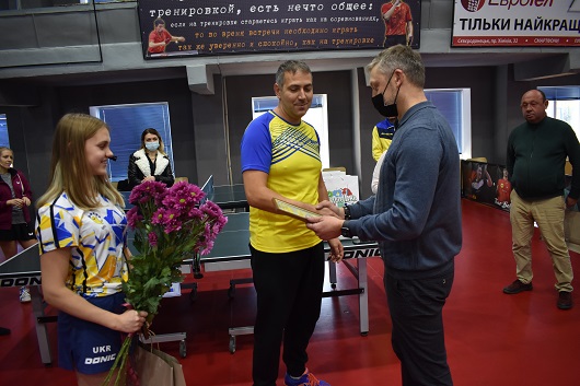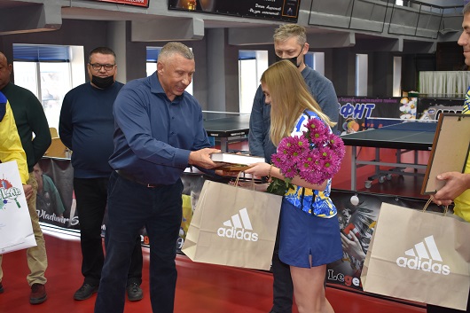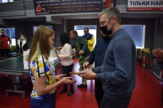 «Нарешті випала нагода особисто привітати вас, пані Софіє, тренера - пана Олександра Мініна! Я знаю, що протягом місяця ви були зайняті підготовкою та участю у різних змаганнях. Вітаю вас с заслуженою та беззаперечною перемогою! Місто Сєвєродонецьк вкотре із гордістю пролунало на всесвітньому рівні. Ваші високі особисті досягнення з настільного тенісу відзначено чемпіонським званням. Сєвєродонецька міська ВЦА і надалі підтримуватиме стипендіями талановитих сєверодонецьких спортсменів», - привітав керівник Сєвєродонецької міської ВЦА Олександр Стрюк.