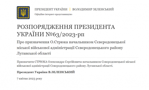 Олександра Стрюка призначено начальником Сєвєродонецької міської військової адміністрації - РОЗПОРЯДЖЕННЯ ПРЕЗИДЕНТА УКРАЇНИ №63/2023-рп