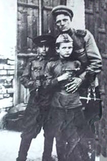 На чорно-білому фото: Віктор Сидорович (на першому плані) з командиром розвідроти ст. лейтенантом Балтишевим в Берліні перед розставанням. Балтишев залишиться служити, а Вітя поїде в Новоайдар до брата Міши. Свого батька і сестру він знайде тільки через 19 років. Це його останнє фронтове фото. А вічний спокій він знайшов у Новоайдарі, де похований поруч з прахом батька.
