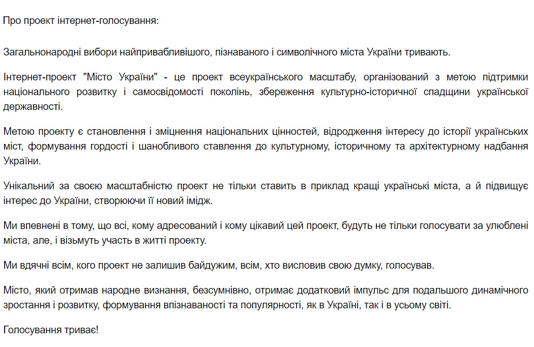 ]]>Голосування Всеукраїнського конкурсу "Місто України. Національний вибір"]]> за прямим посиланням: ]]>https://mistoua.com.ua/]]>