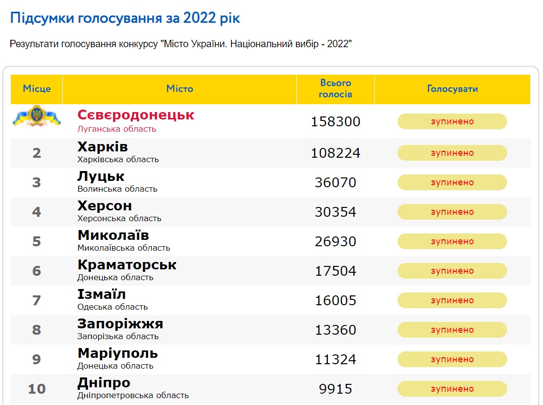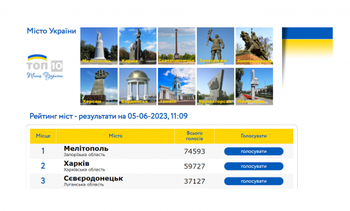 Приємно відмітити, що переможець минулорічного ]]>Всеукраїнського конкурсу "Місто України. Національний вибір"]]> Сєвєродонецьк, за результатами  ]]>голосування]]>, станом на 05.06.2023 року, знову знаходиться у трійці лідерів.
