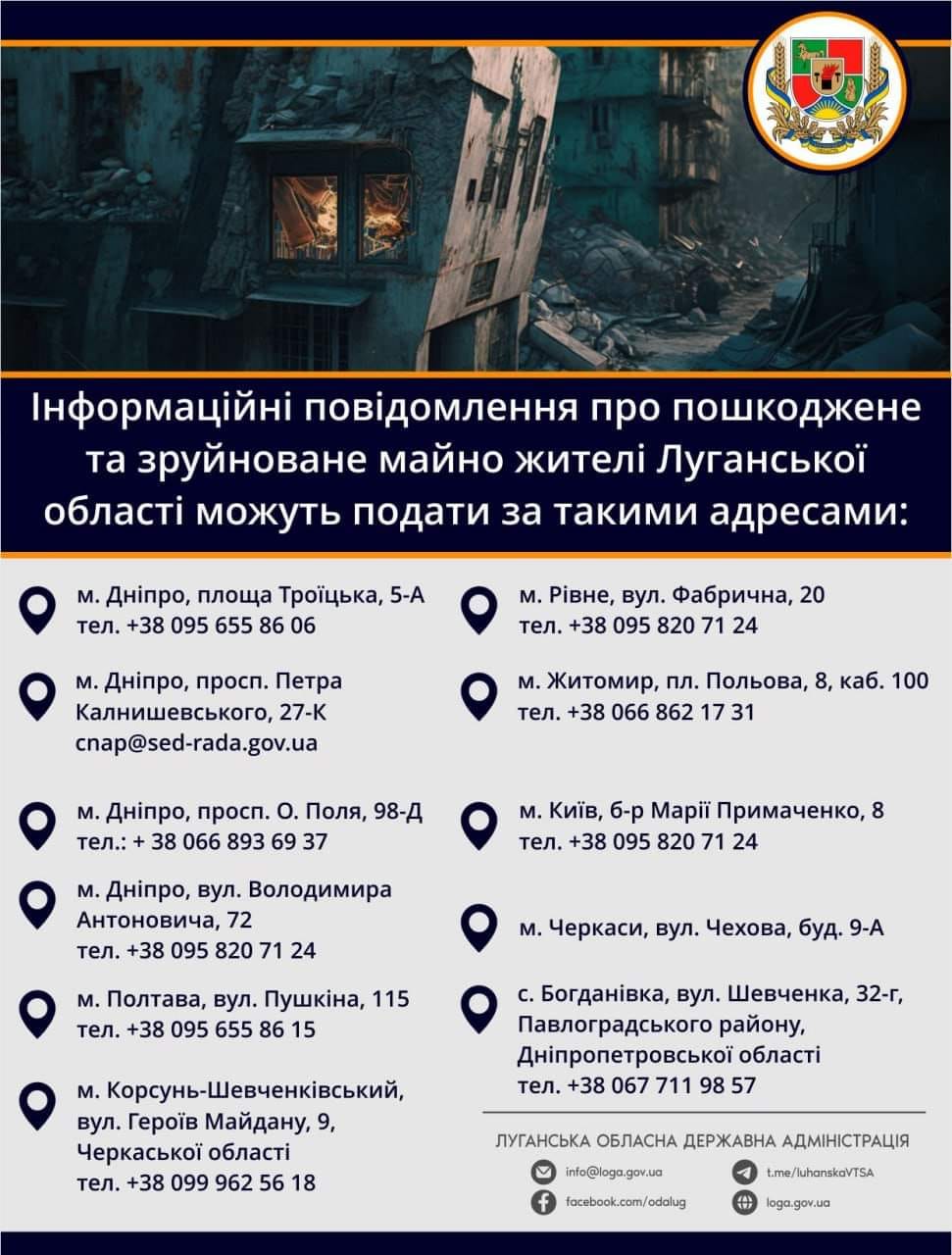 Так, ВПО Луганської області незалежно від свого місця реєстрації можуть подати інформаційні повідомлення про пошкоджене та зруйноване майно через адміністраторів ЦНАПів в гуманітарних хабах за такими адресами: