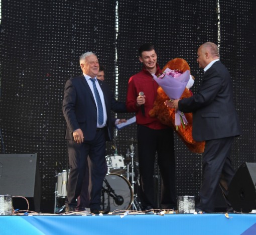 На головній святковій сцені в.о. міського голови Вячеслав Ткачук і керуючий справами виконкому Юрій Журба подарували немовляті м’яку іграшку – великого ведмедя, яку вручили батькові.