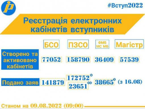Станом на 9 серпня 2022 року для вступу до ЗФПО та ЗВО створено і активовано майже 330 тис. електронних кабінетів. Подано понад 376 тис. електронних заяв.