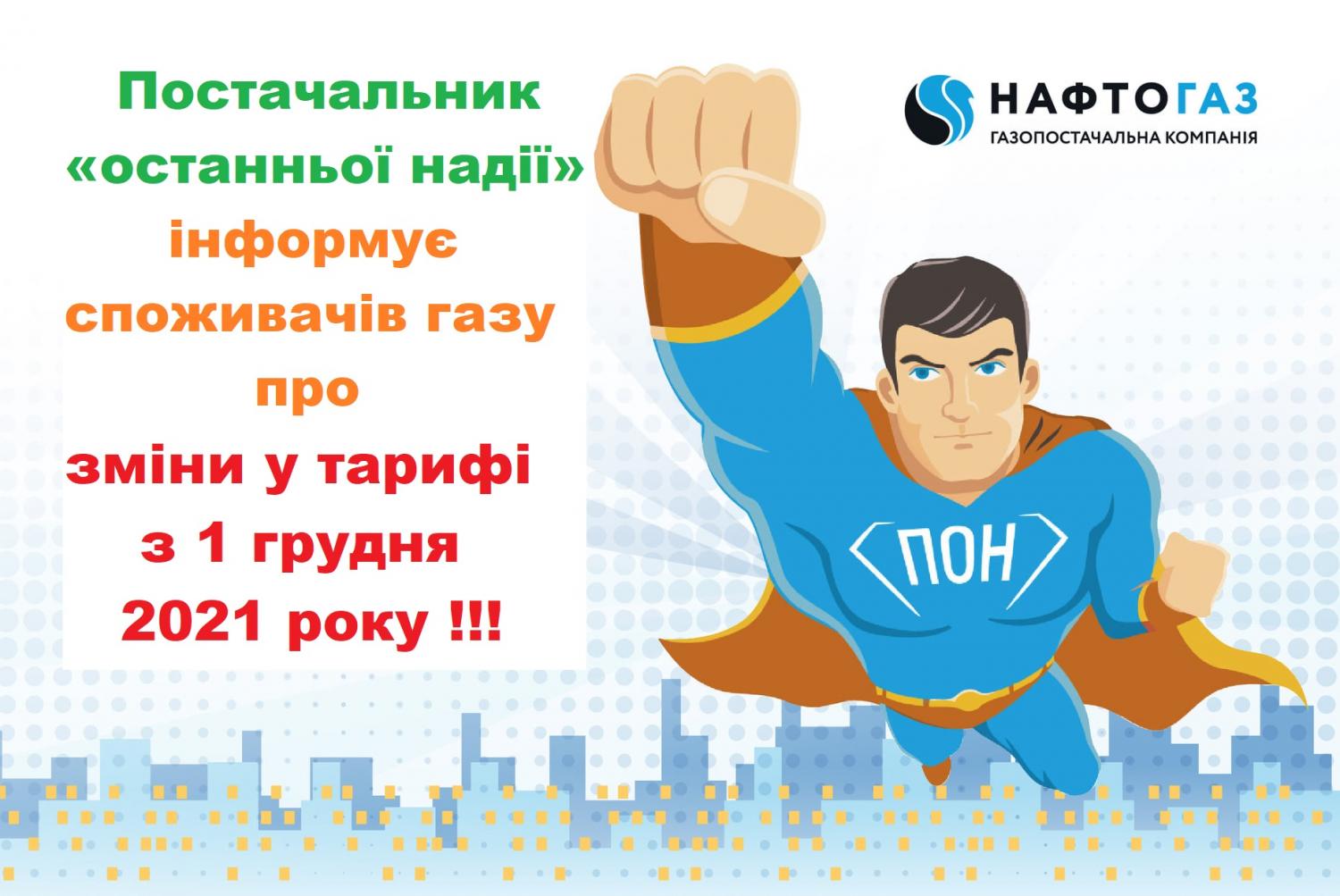 Постачальник «останньої надії» інформує споживачів газу про зміни у тарифі з 1 грудня 2021 року