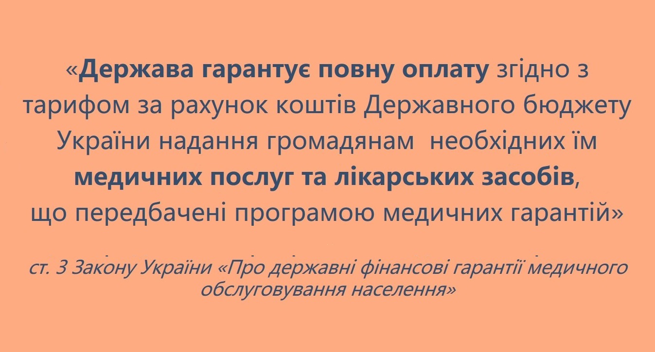 Нагадаємо, Закон України «Про державні фінансові гарантії медичного обслуговування населення» передбачає, що держава гарантує у межах програми медичних гарантій повну оплату коштом Державного бюджету України необхідних медичних послуг та лікарських засобів, пов’язаних з наданням: