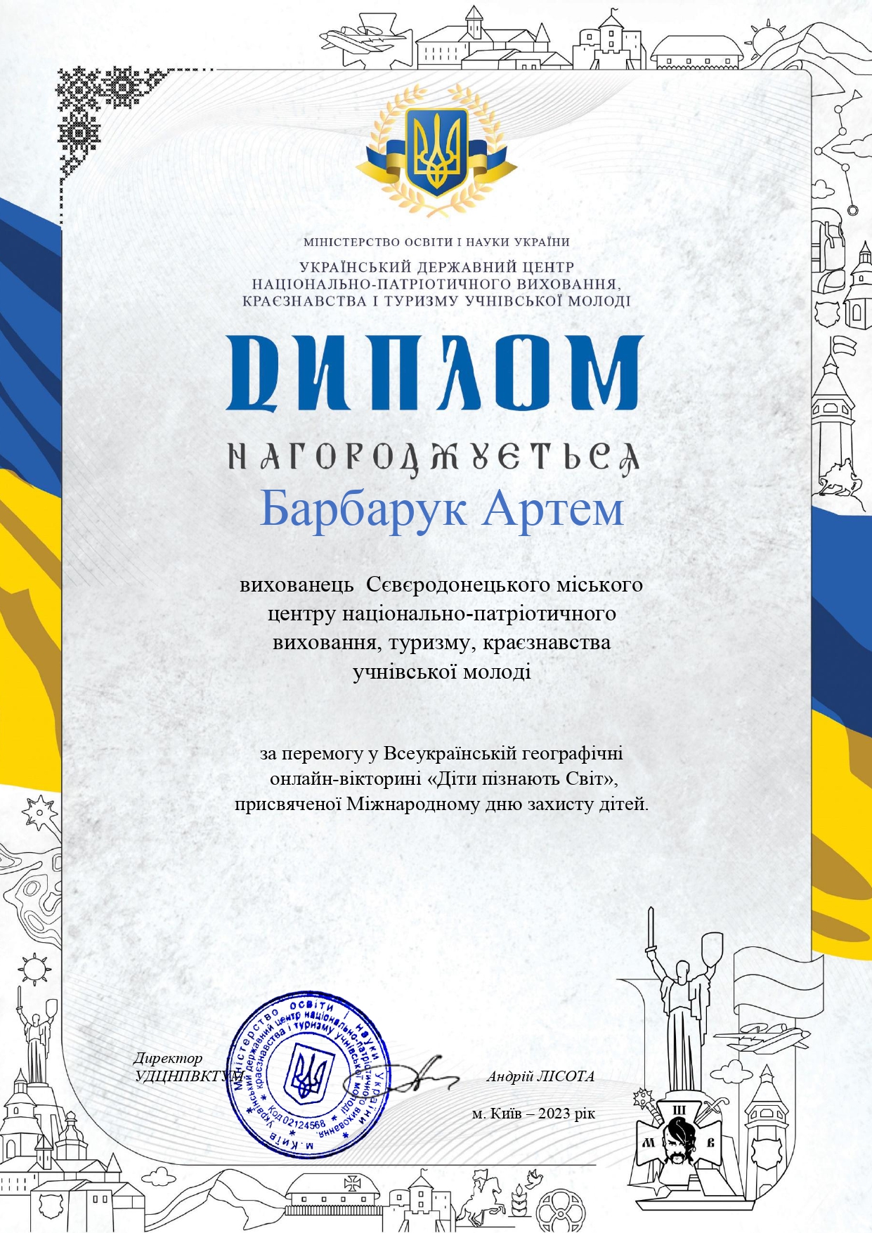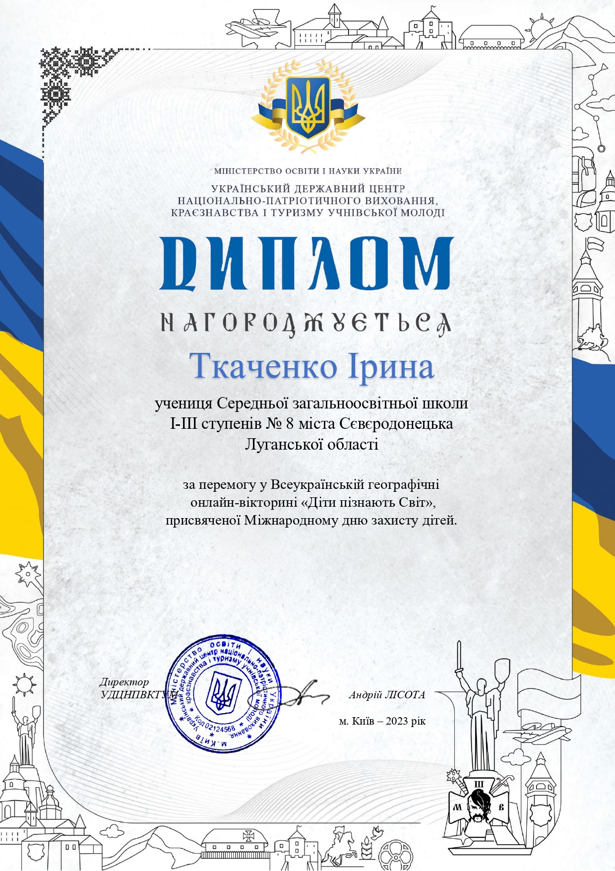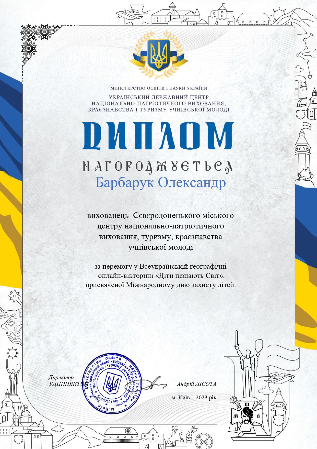 1 червня 2023 року за ініціативою Українського державного центру національно-патріотичного виховання, краєзнавства і туризму учнівської молоді проходила Всеукраїнська географічна онлайн-вікторина «Діти пізнають Світ», присвячена Міжнародному дню захисту дітей.