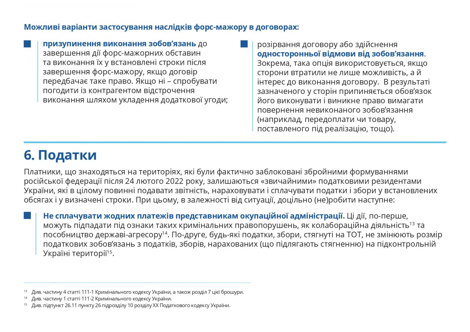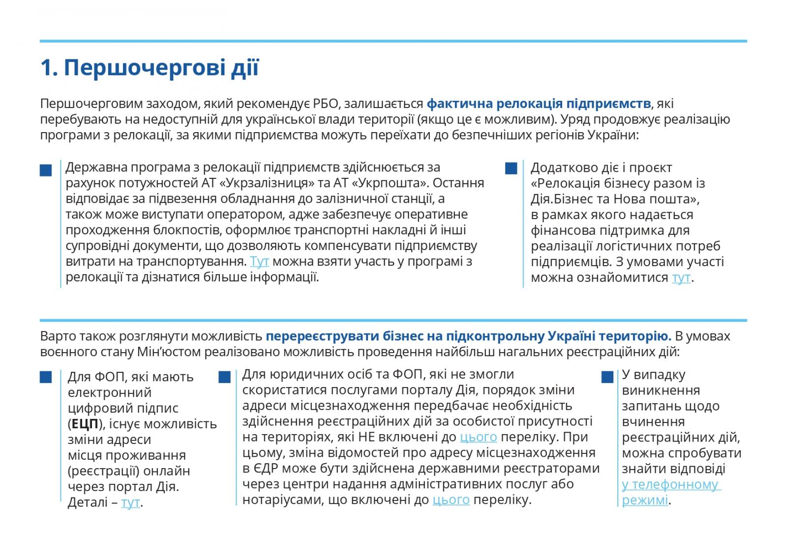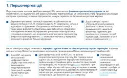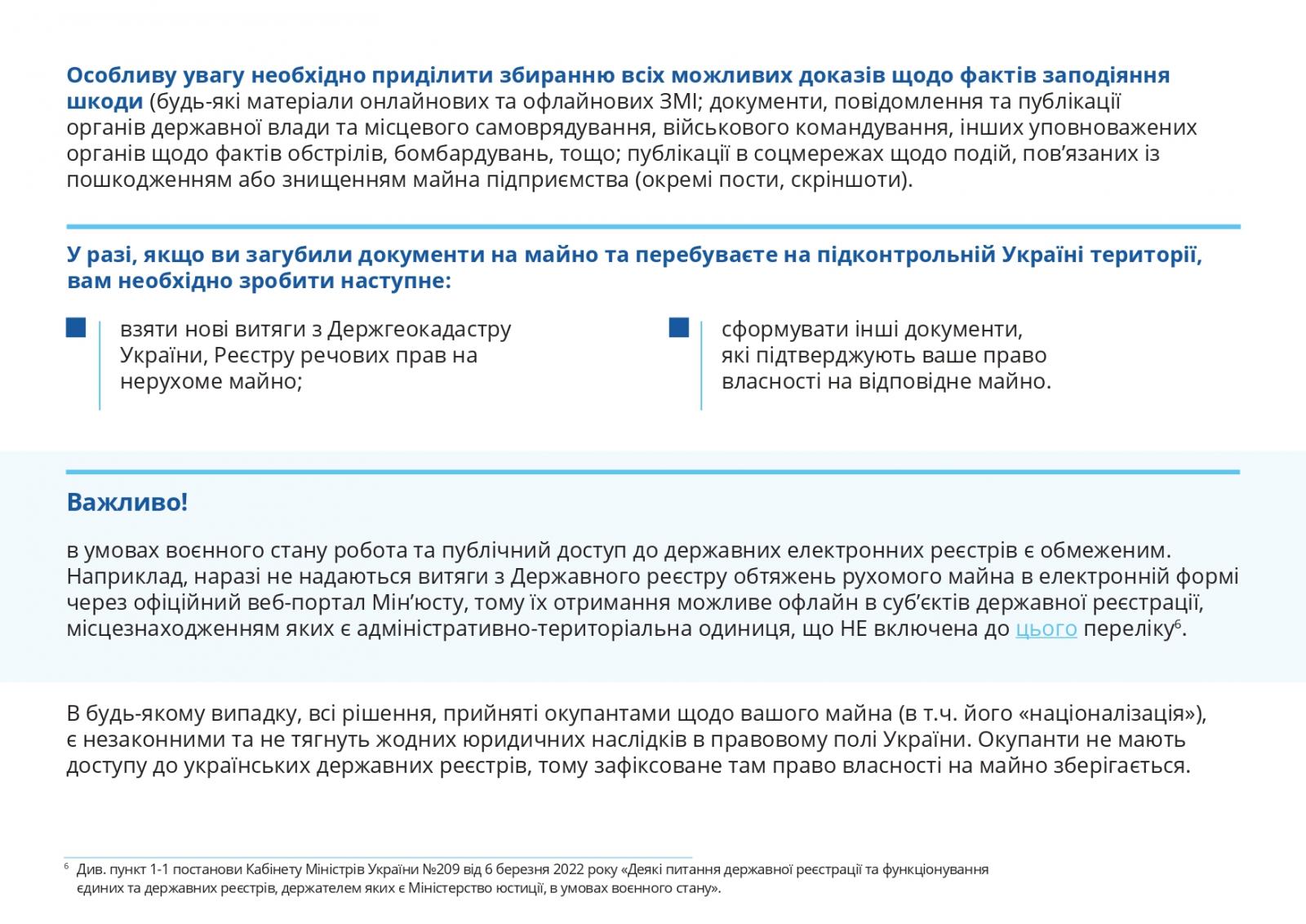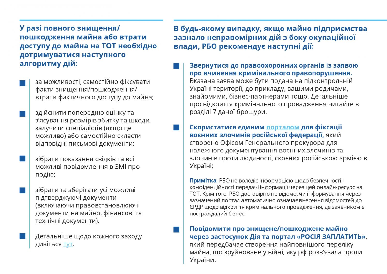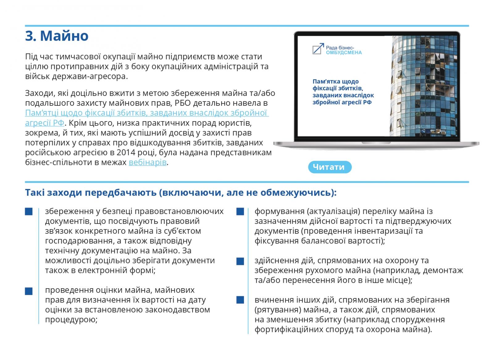 Брошура охоплює перелік рекомендацій щодо збереження та захисту майнових прав, взаємодії з найманими працівниками, контрагентами, податковими органами, а також містить алгоритм дій у випадку настання форс-мажору тощо.