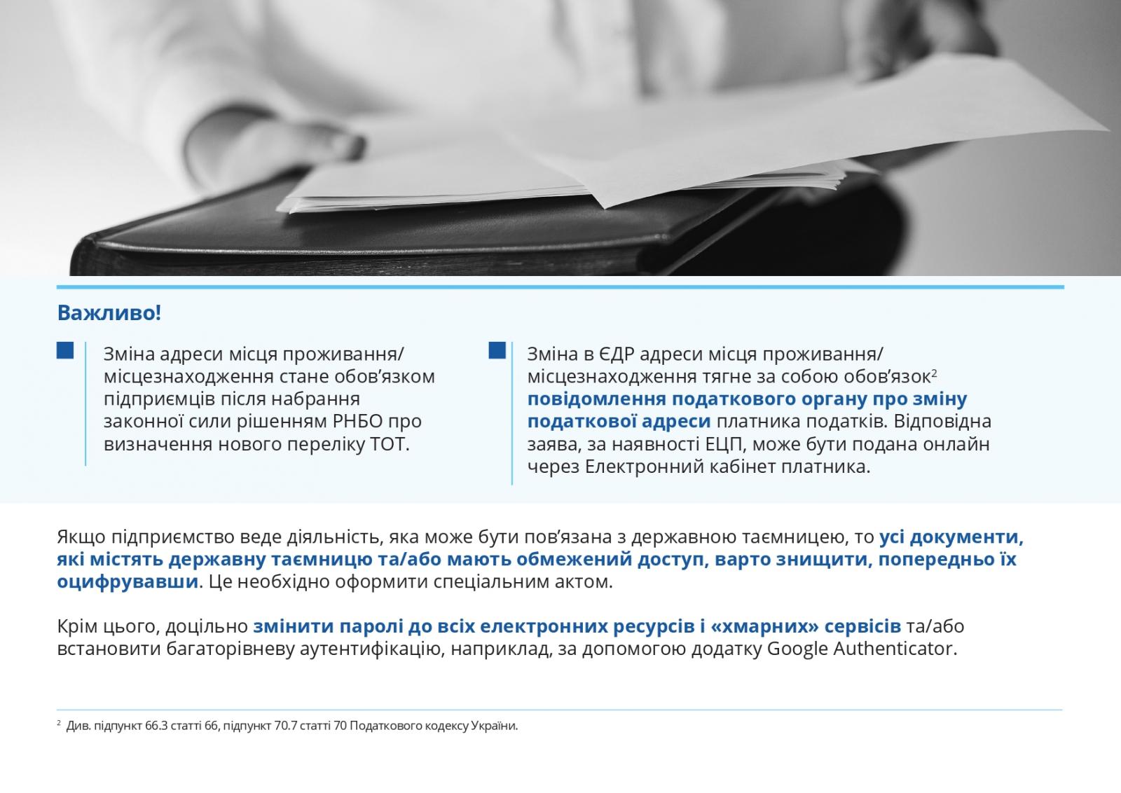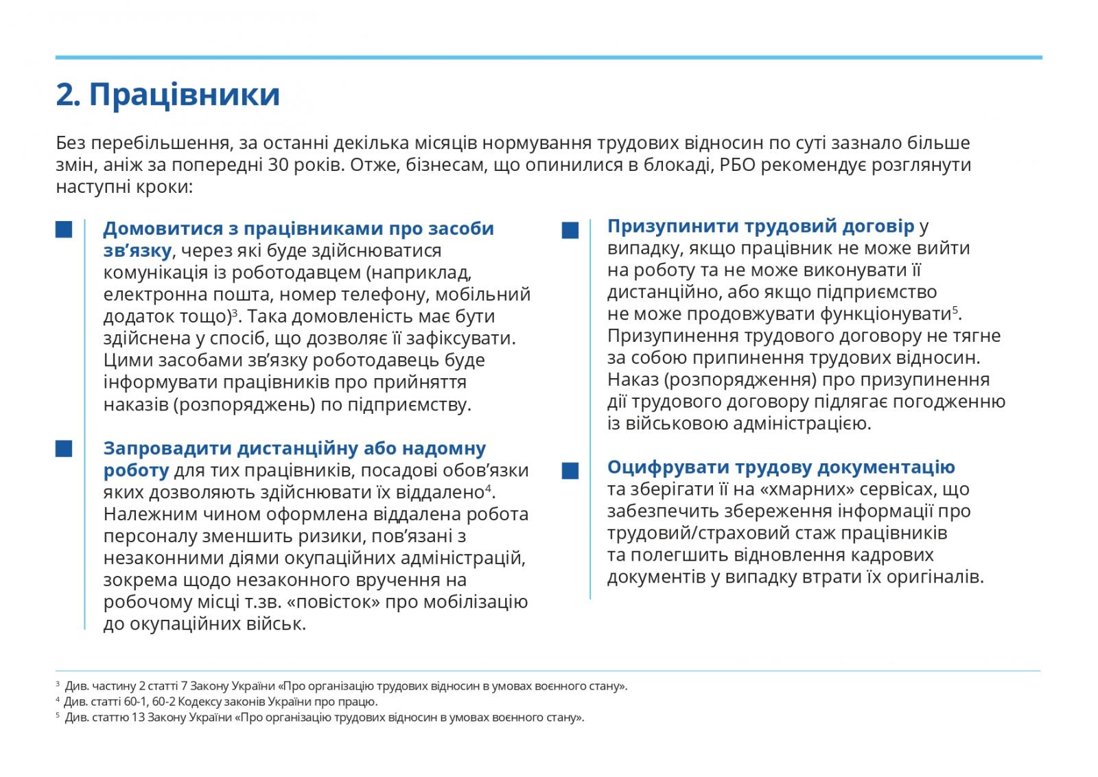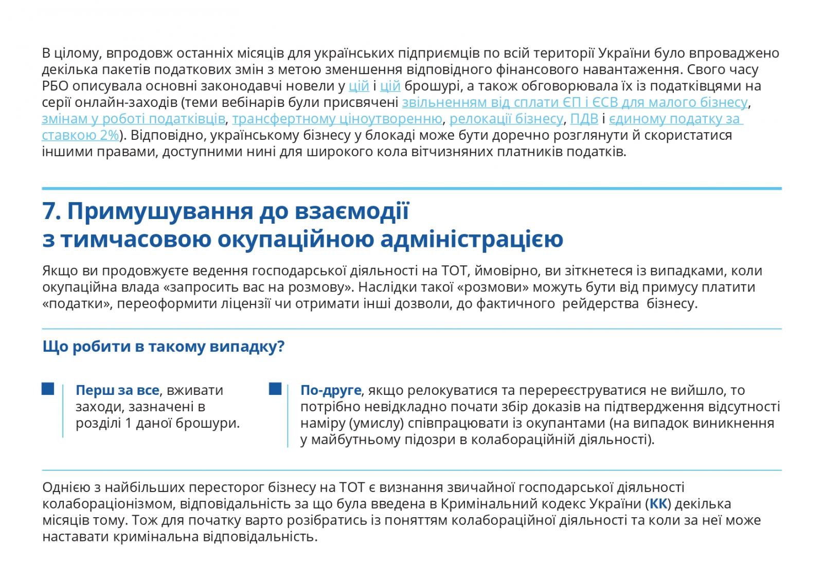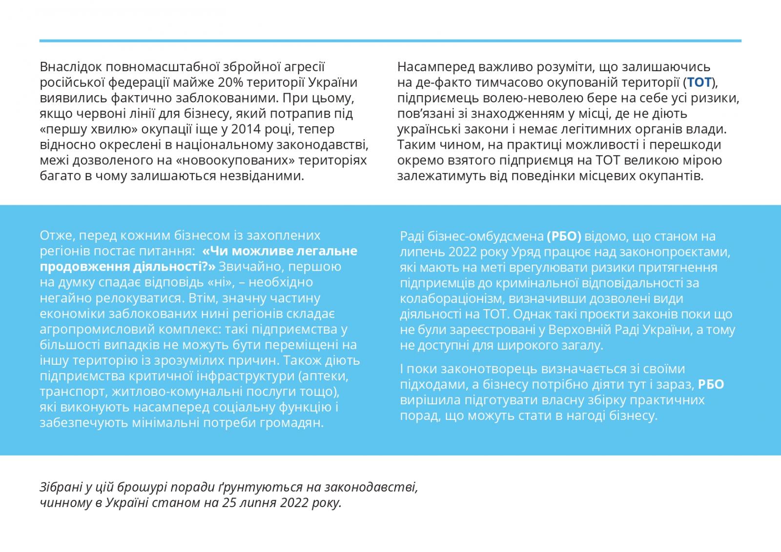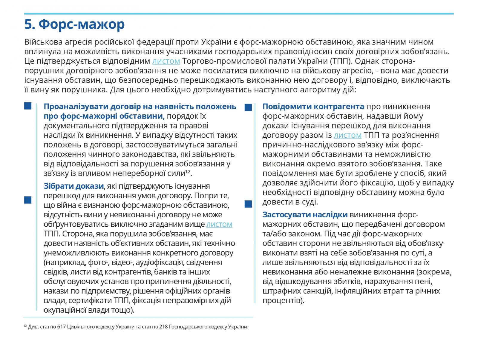 Брошура охоплює перелік рекомендацій щодо збереження та захисту майнових прав, взаємодії з найманими працівниками, контрагентами, податковими органами, а також містить алгоритм дій у випадку настання форс-мажору тощо.