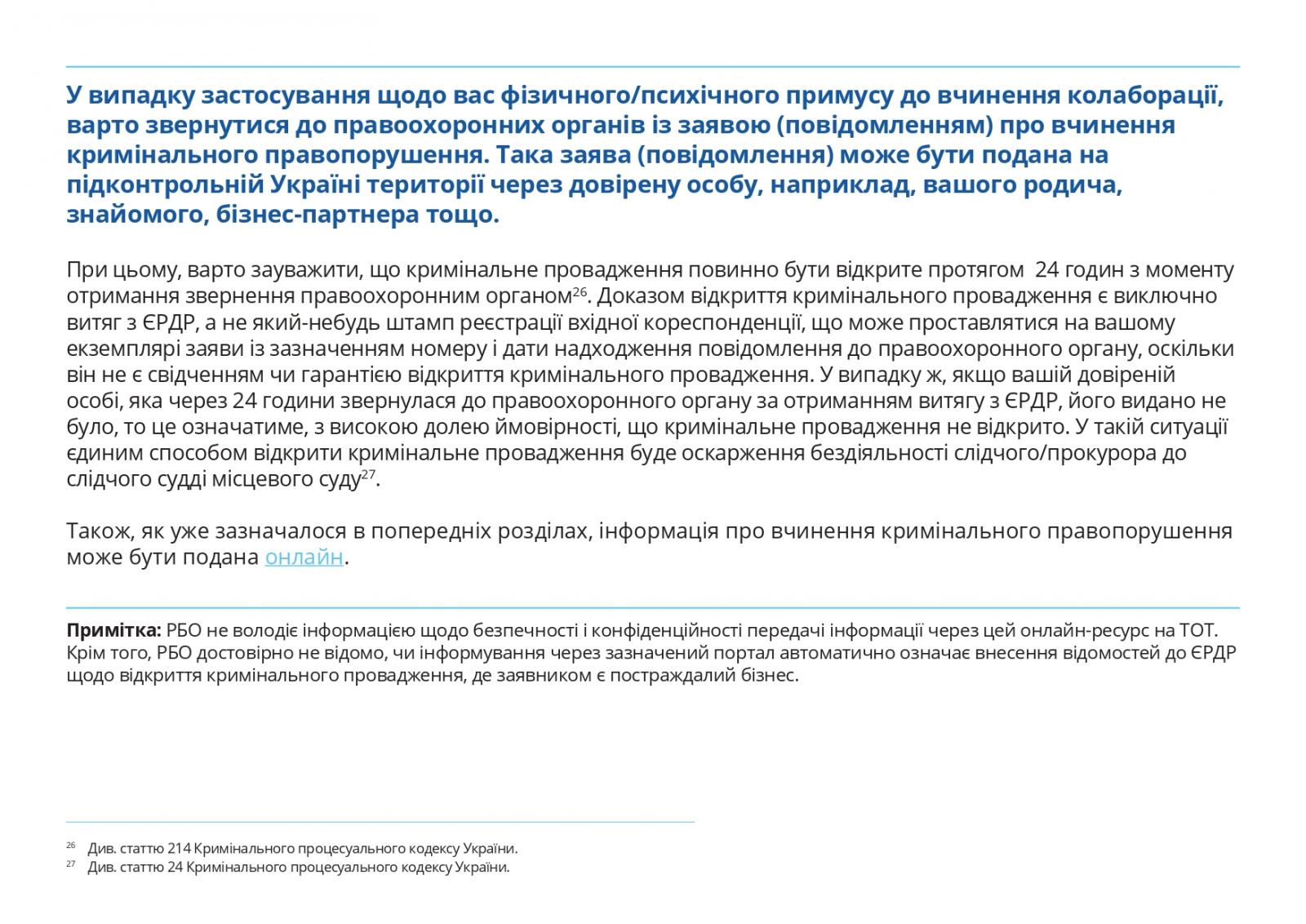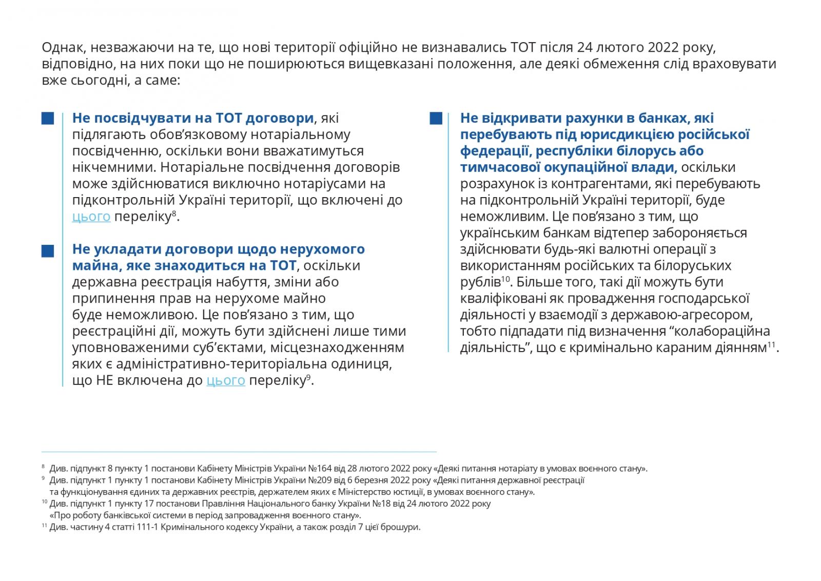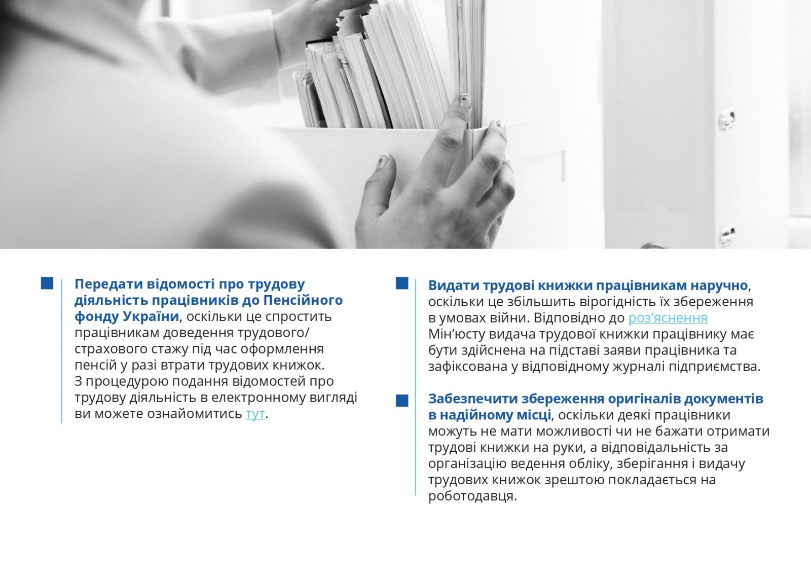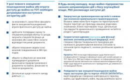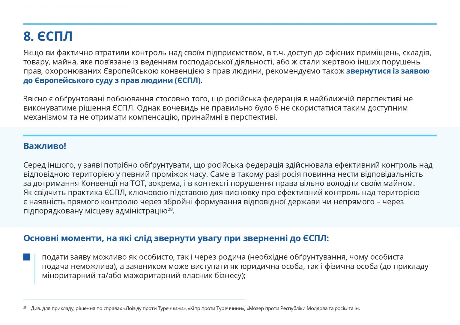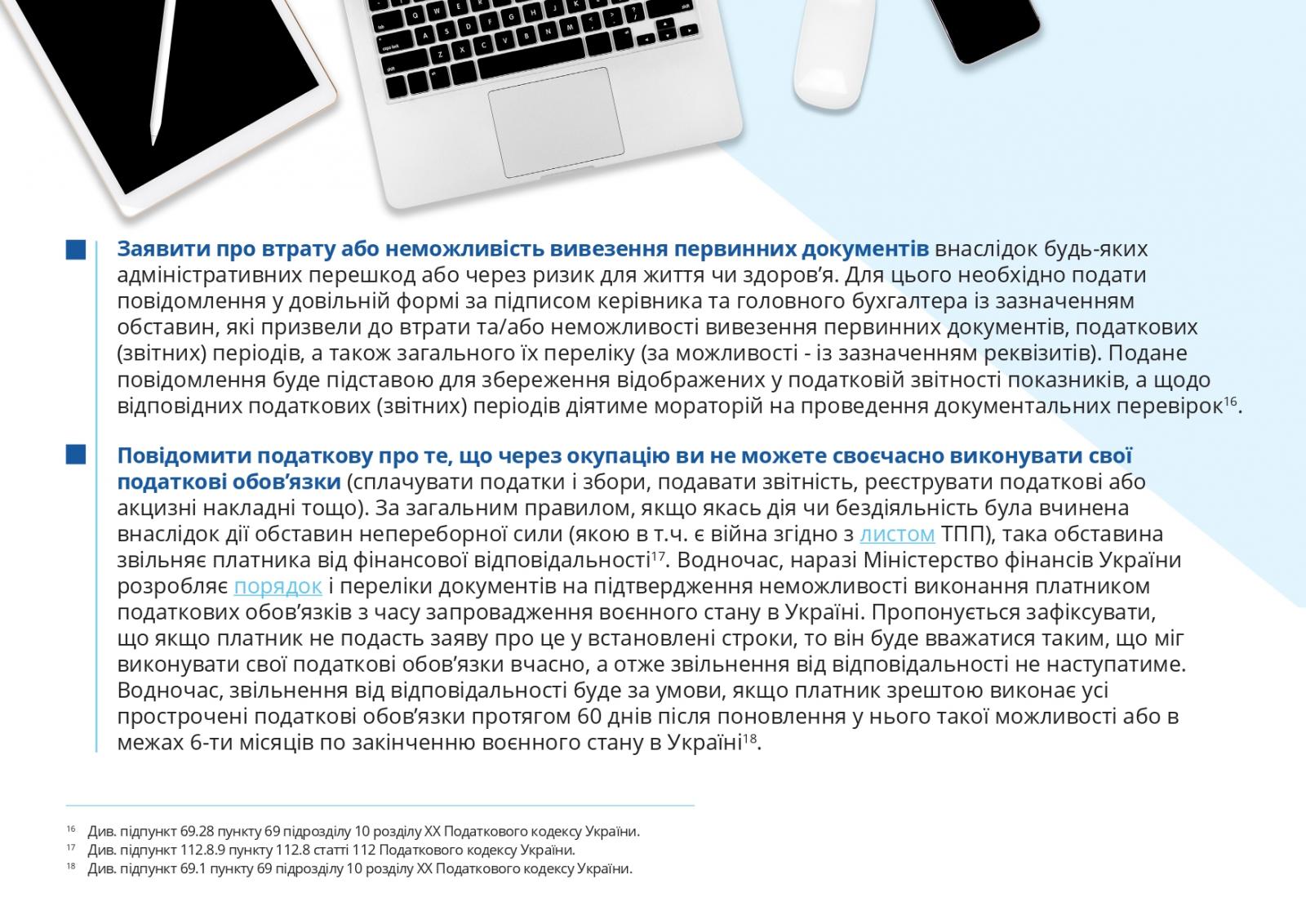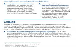 Брошура охоплює перелік рекомендацій щодо збереження та захисту майнових прав, взаємодії з найманими працівниками, контрагентами, податковими органами, а також містить алгоритм дій у випадку настання форс-мажору тощо.