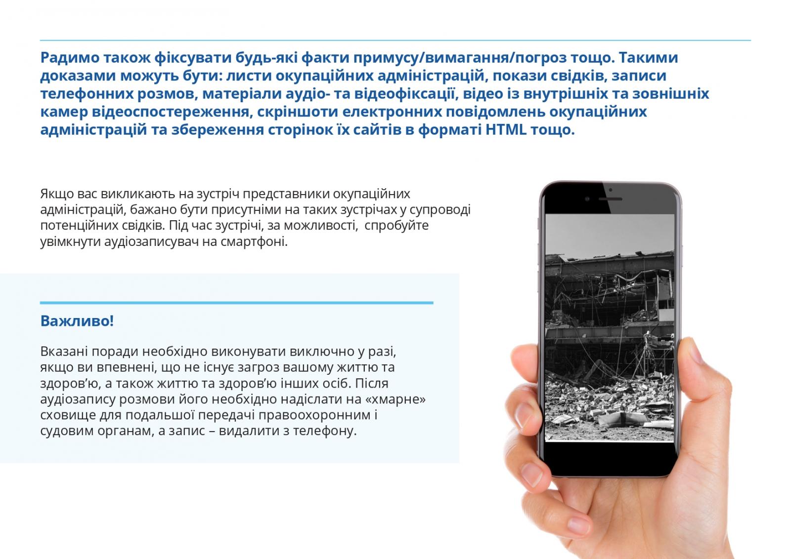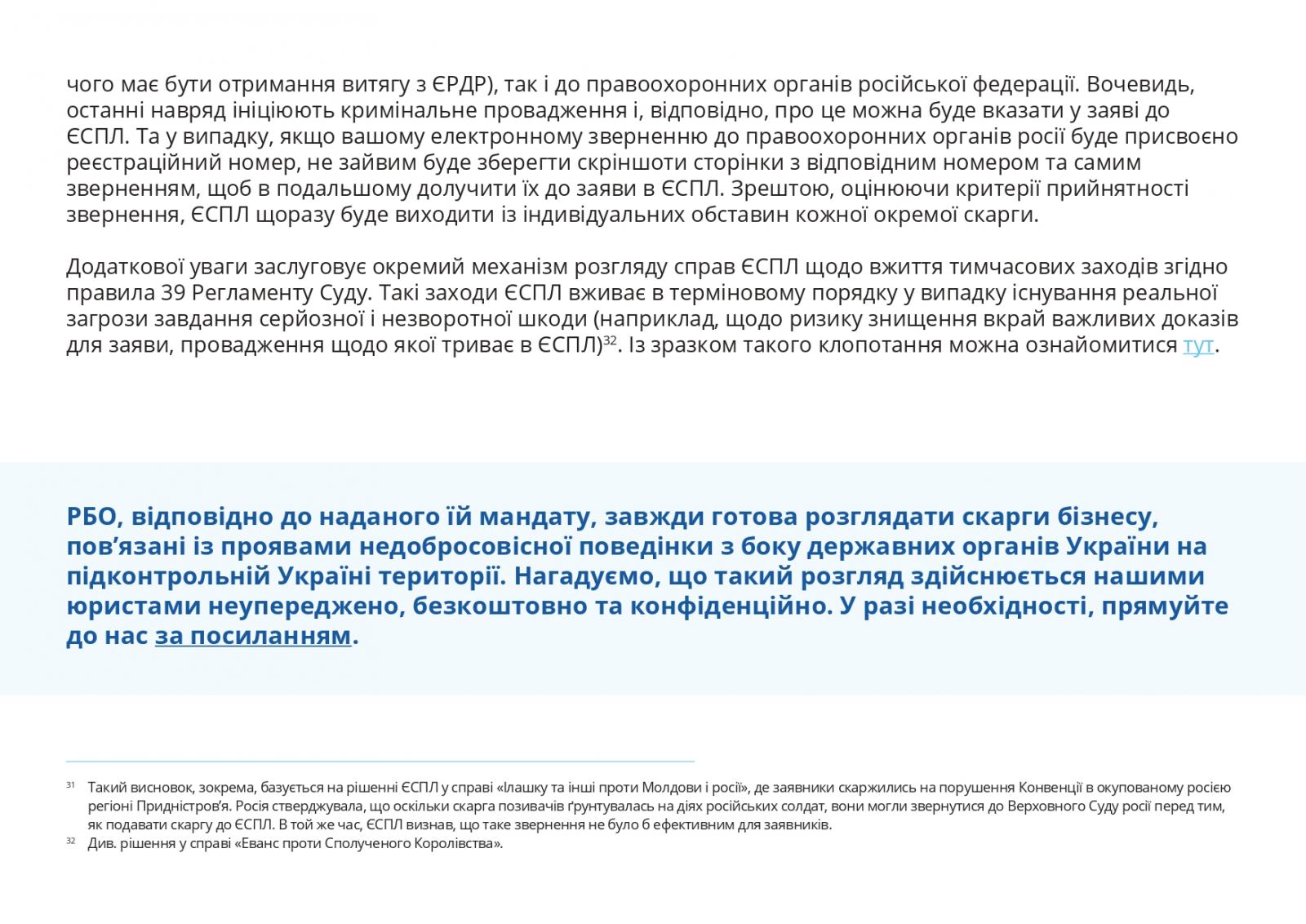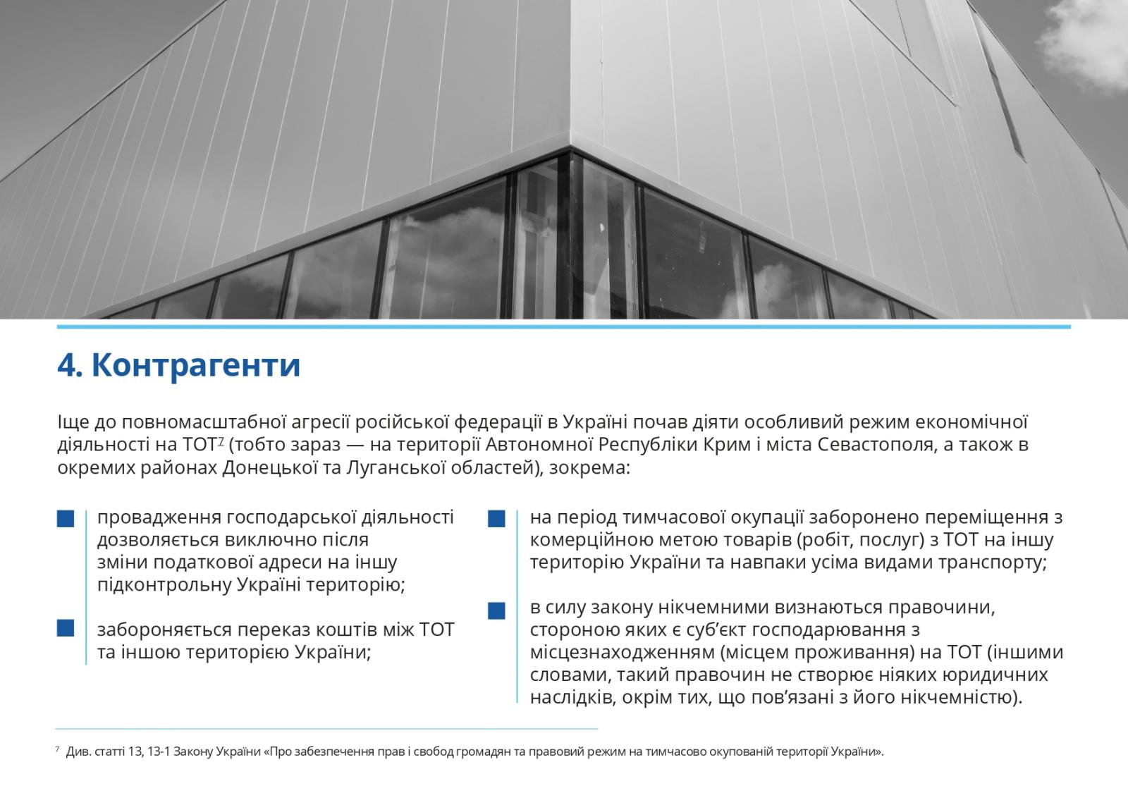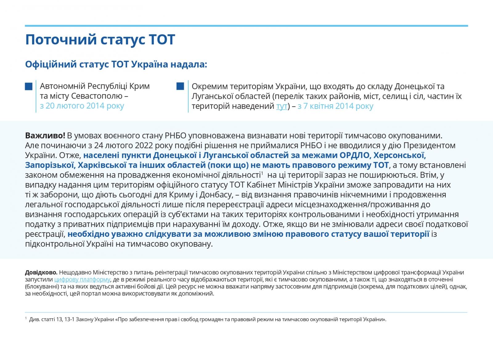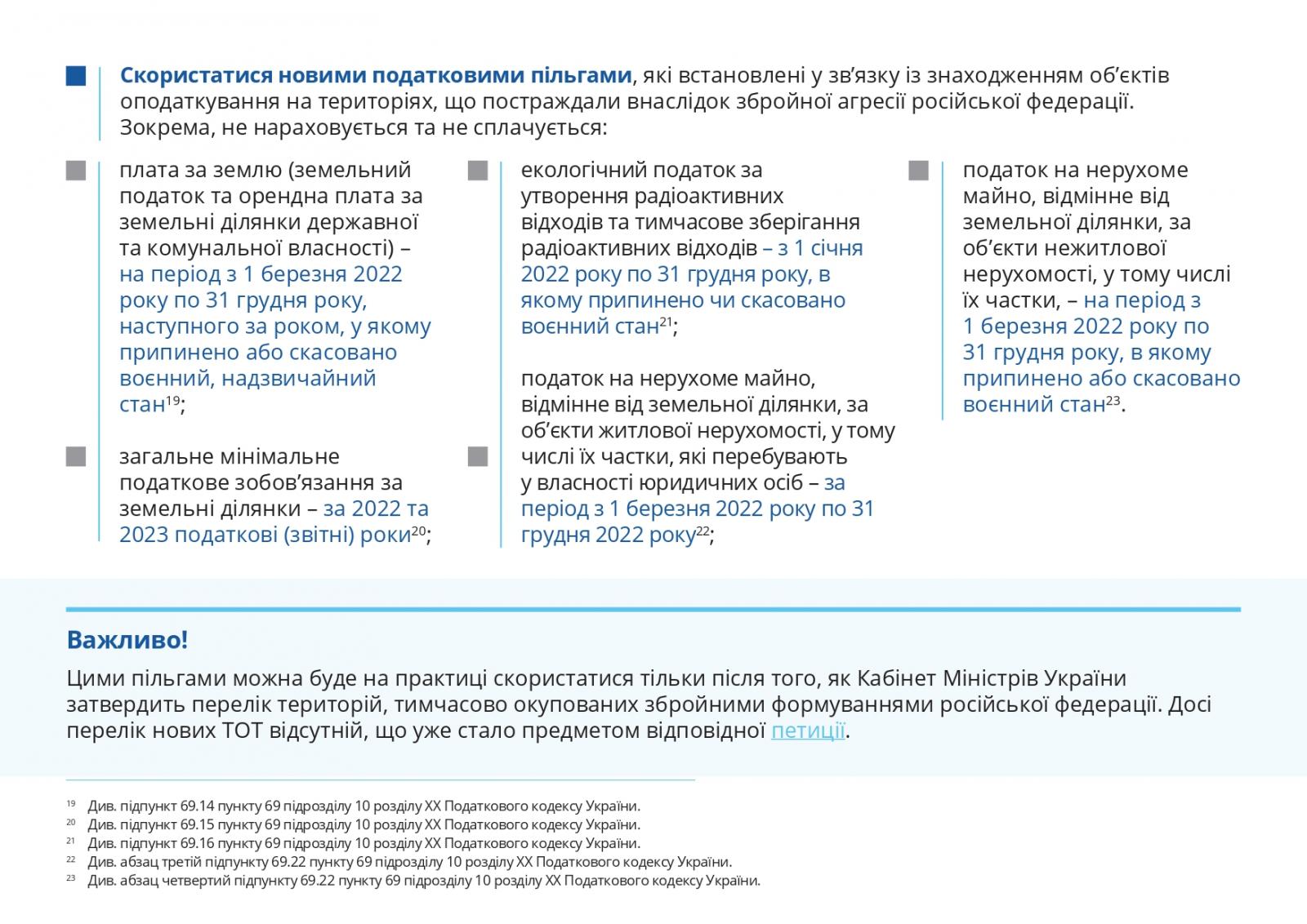 Брошура охоплює перелік рекомендацій щодо збереження та захисту майнових прав, взаємодії з найманими працівниками, контрагентами, податковими органами, а також містить алгоритм дій у випадку настання форс-мажору тощо.