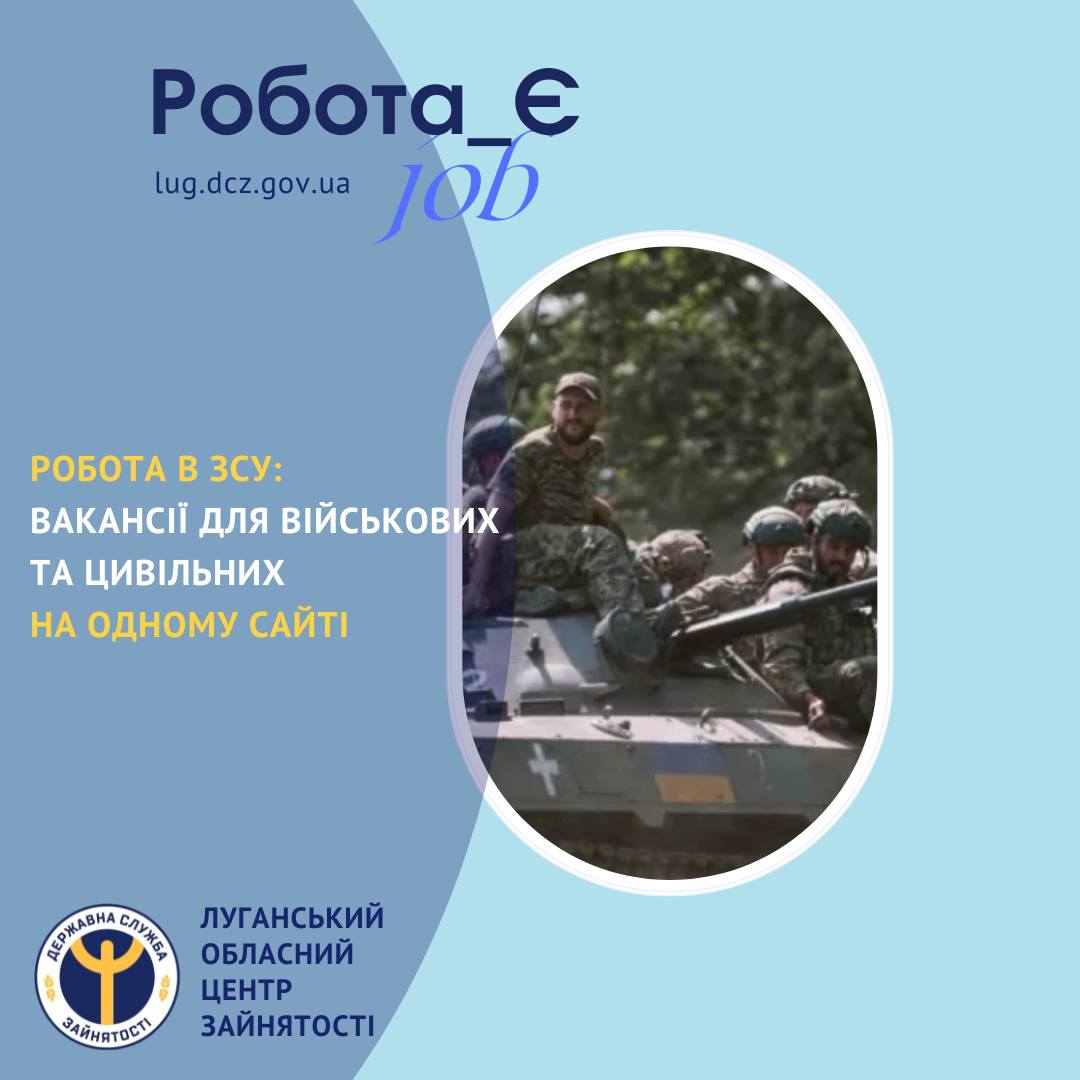 Джерело: Луганський обласний центр зайнятості - https://lug.dcz.gov.ua/novyna/robota-v-zsu-vakansiyi-dlya-viyskovyh-ta-c...