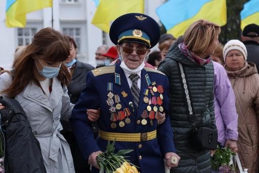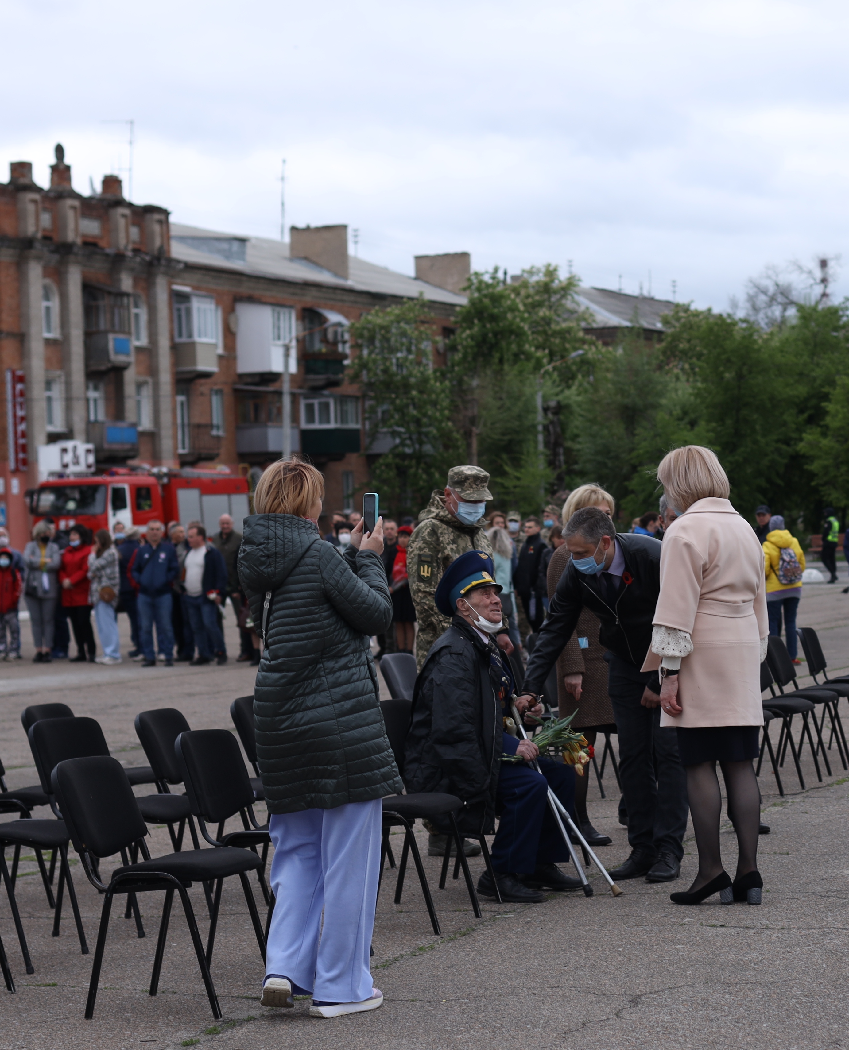 На площі Миру зі словами вітання до ветеранів, мешканців і громадськості звернулись очільники області та міста, ветеранської організації, місьвійськкомату та представники духовенства.