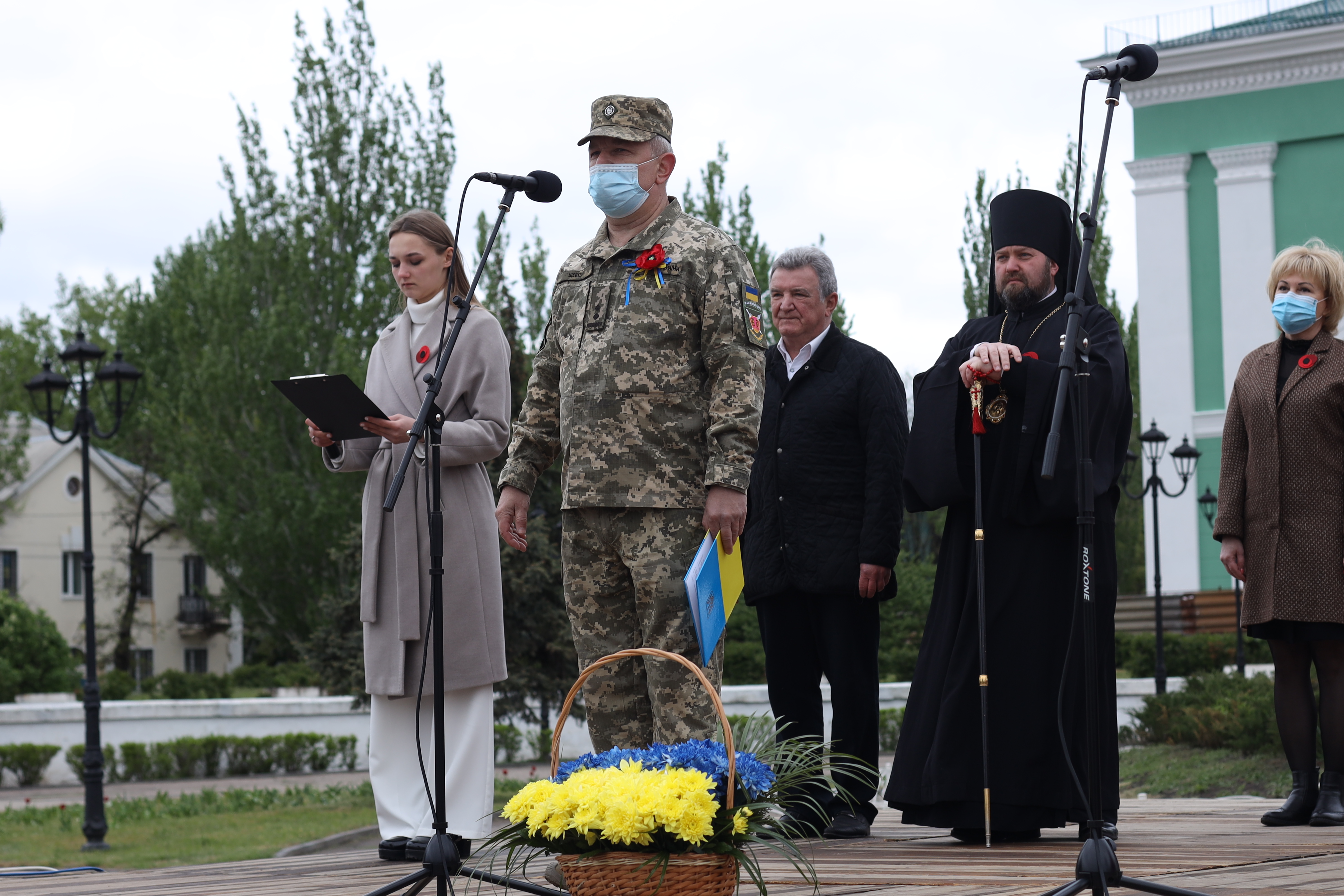 З вітальним словом виступили голова міської ради ветеранів Сергій Дядик, міський військовий комісар Володимир Щебець і також Єпископ Луганський і Старобільський Афанасій.