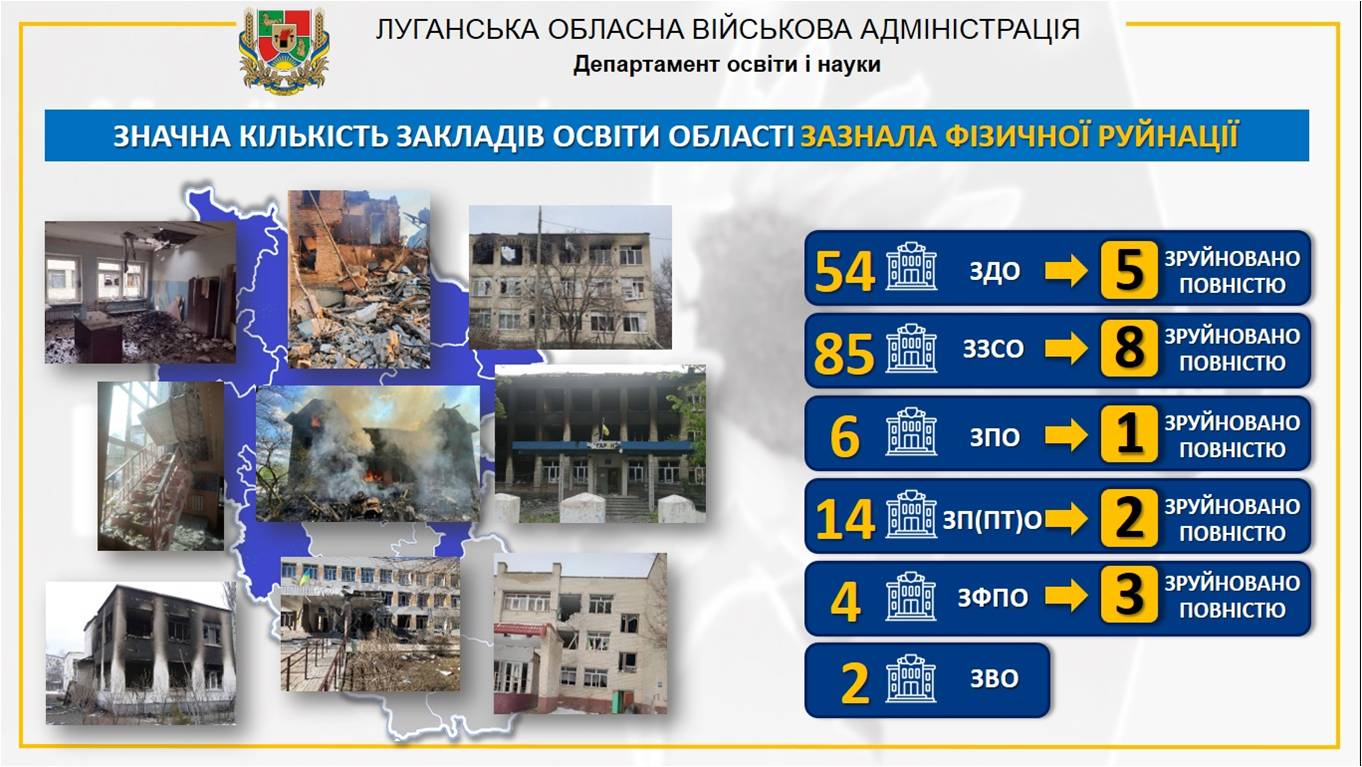 - 54 заклади дошкільної освіти (5 зруйновано повністю);