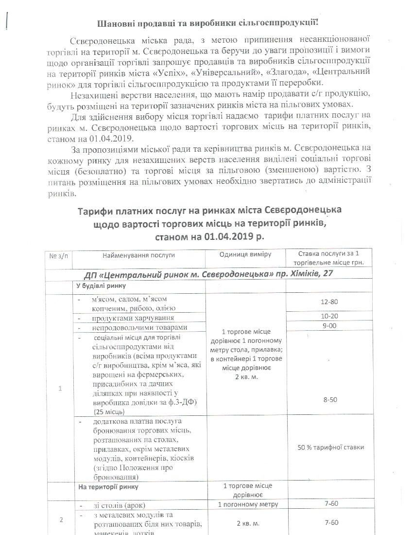 Для здійснення вибору місця торгівлі надаємо тарифи платних послуг на ринках м. Сєвєродонецька щодо вартості торгових місць на території ринків, станом на 01.04.2019.