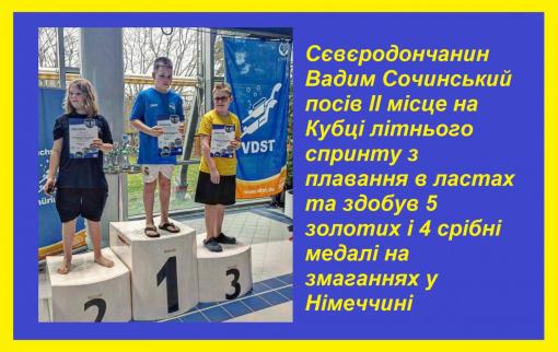 Сєвєродончанин Вадим Сочинський посів ІІ місце на Кубці літнього спринту з плавання в ластах та здобув 5 золотих і 4 срібні медалі на змаганнях у Німеччині