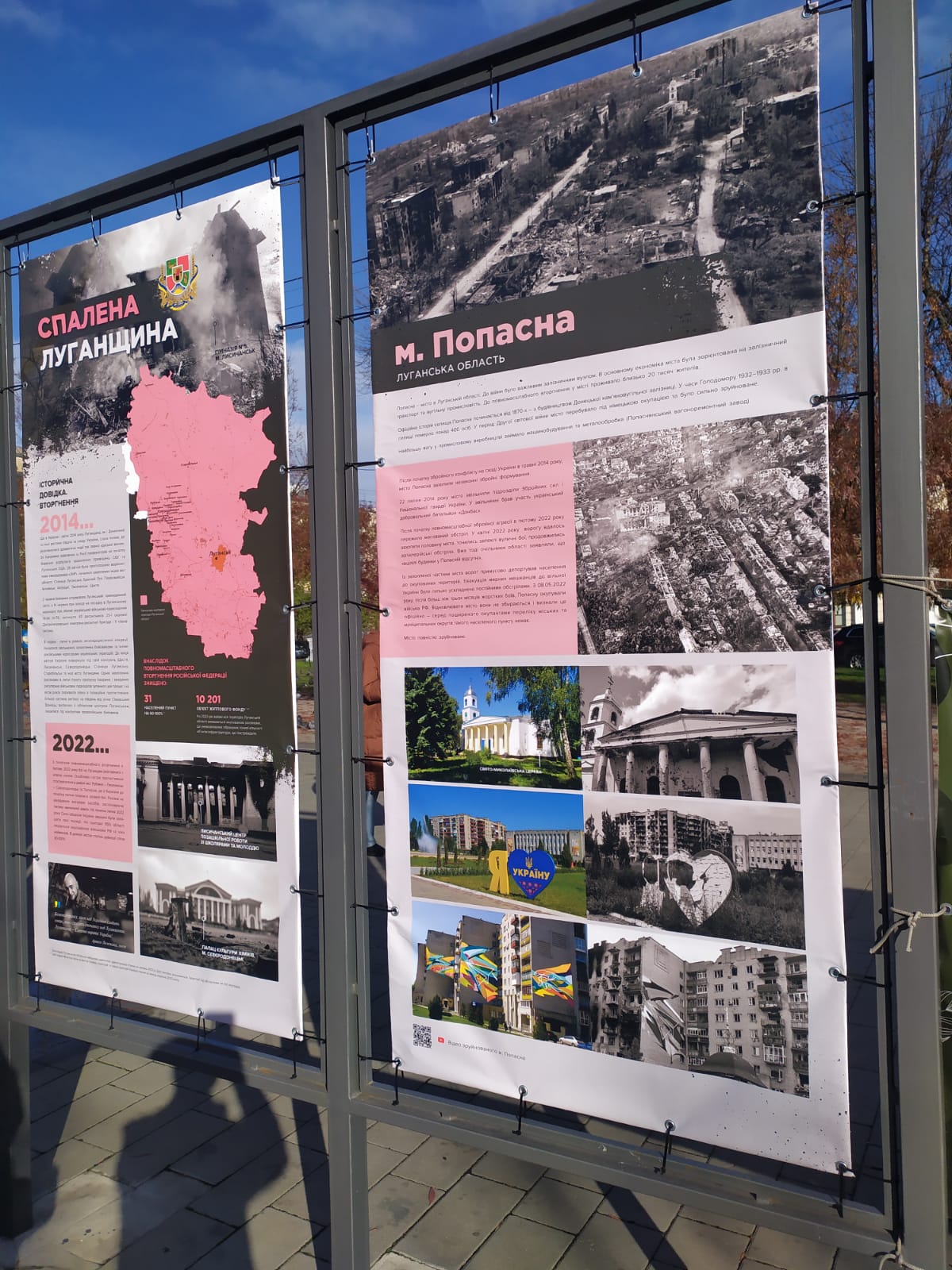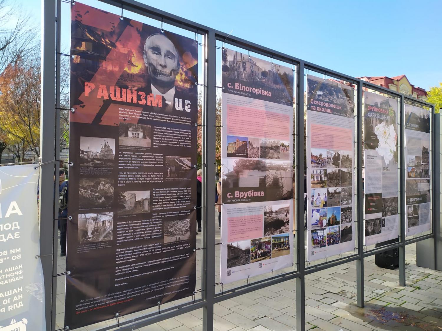 На стендах розміщені QR-коди з посиланням на короткі відео зі знищених росією українських населених пунктів.