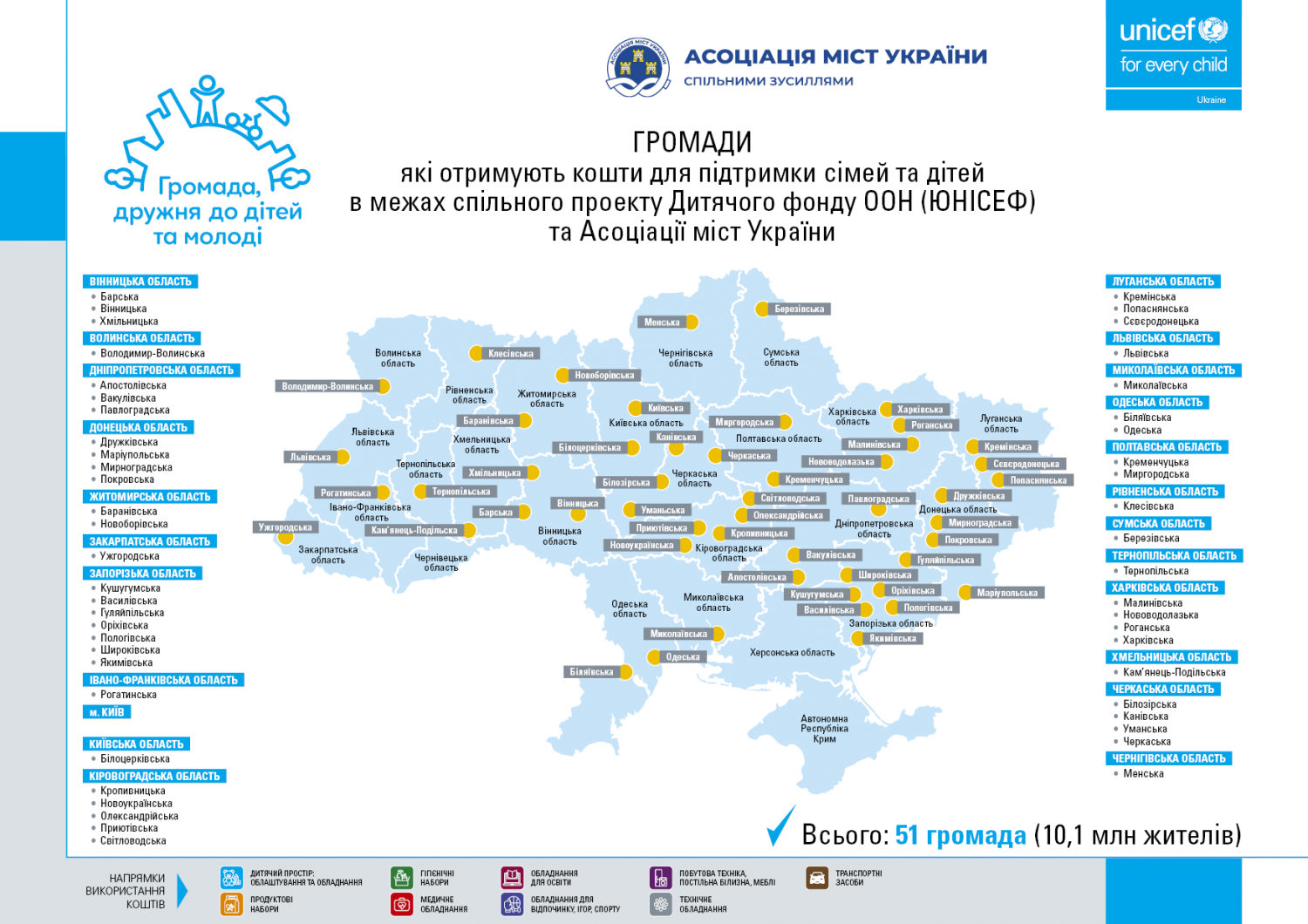 Дитячий Фонд ООН (ЮНІСЕФ) в Україні у партнерстві з Асоціацією міст України допомагають органам місцевого самоврядування забезпечувати в громадах необхідний захист та підтримку сімей з дітьми, які постраждали внаслідок воєнних дій. В рамках співпраці передбачається надання 51 територіальній громаді цільової фінансової підтримки у розмірі 50 тисяч доларів США - повідомляють в Асоціації міст України. Ці кошти громади спрямують на забезпечення внутрішньо переміщених осіб та сімей з дітьми, які постраждали внаслідок військової агресії рф, товарами і предметами першої необхідності, а також на задоволення їх основних медичних, освітніх, соціальних потреб. В рамках співпраці експерти Асоціації проводять серію тренінгів для органів місцевого самоврядування з метою підвищення їх організаційної спроможності у питаннях фінансування в умовах воєнного стану, проведення закупівель, антикорупційних та інших питань.