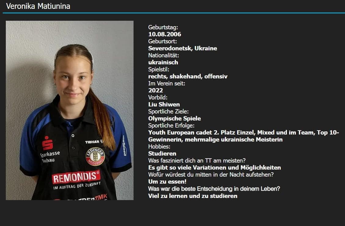 Вихованка КДЮСШ 1 м.Сєвєродонецьк Луганської області, майстер спорту України з тенісу настільного, гравець клубу Cуперліги України «КДЮСШ № 1 - ЛОШВСМ» Вероніка Матюніна розпочала виступи у третій за силою лізі Німеччини – 3. Bundesliga Damen Süd за команду TSV Schwabhausen II.