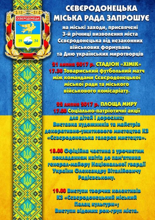 СЄВЄРОДОНЕЦЬКА МІСЬКА РАДА ЗАПРОШУЄ на міські заходи, присвячені 3-й річниці визволення міста Сєвєродонецька від незаконних військових формувань та Дню українських миротворців